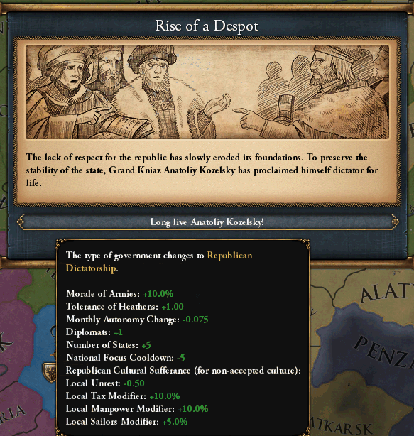 テストプレイでは独裁官の死後、一足早い封建制君主国家ロマノフ朝ノブゴロドが誕生いたしましたのでフレーバー要素でみても個人的には大満足でした。