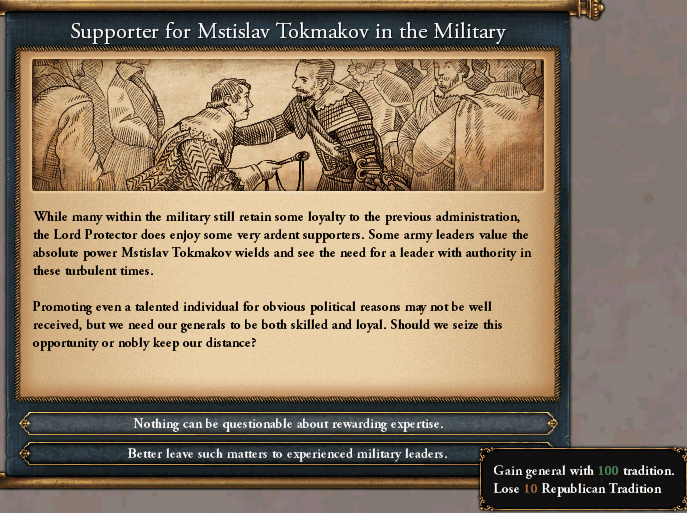 君主制ですと馬上槍試合で平民が優勝し陸軍指揮官get等のイベントがありますが、共和制でも時折陸軍伝統100の将軍を雇えるランダムイベントが起こりますので、戦闘面の不利益はないと感じます。