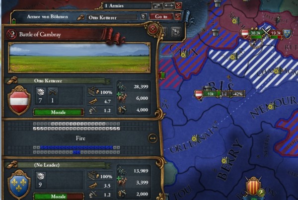 「最初の会戦はフランス北部、Cambrayで行われました。自軍4万対敵軍2万。士気は4.7対3.5」