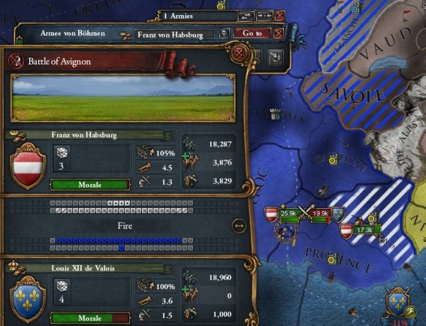 分かってる。でもまぁ、エランだけなら勝てないこともない。エランの補正が20だけど、オーストリア補正が10とDefensive補正が15あるから、一応こっちが強い。相手もDefensive取ったりすれば別だけど、あいつら軍事アイデア取ってないしな。