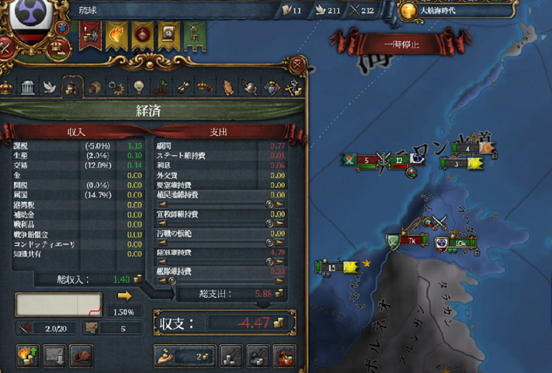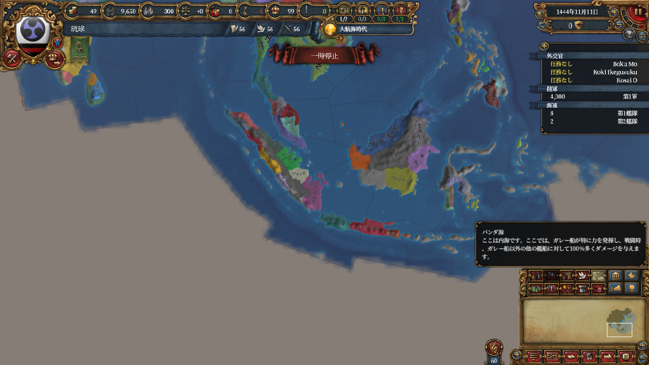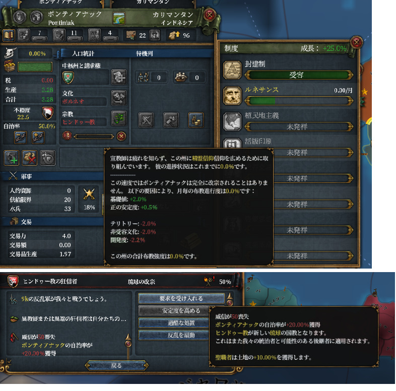 サンバスのポンティアナック州を君主点を使い開発します。従属国の土地を開発すると独立欲求が下がります。