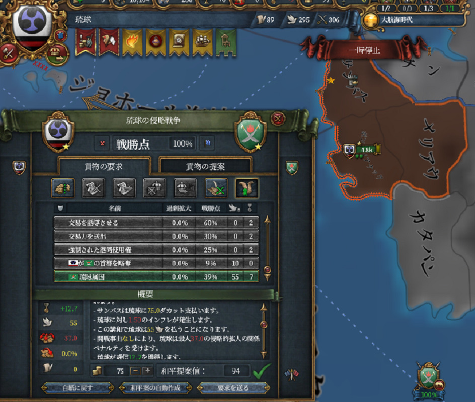 1448年10月勝利、講和条件はサンバスの属国化と賠償金75ダカットです。領土はコア化ができない距離なんでもらえません。