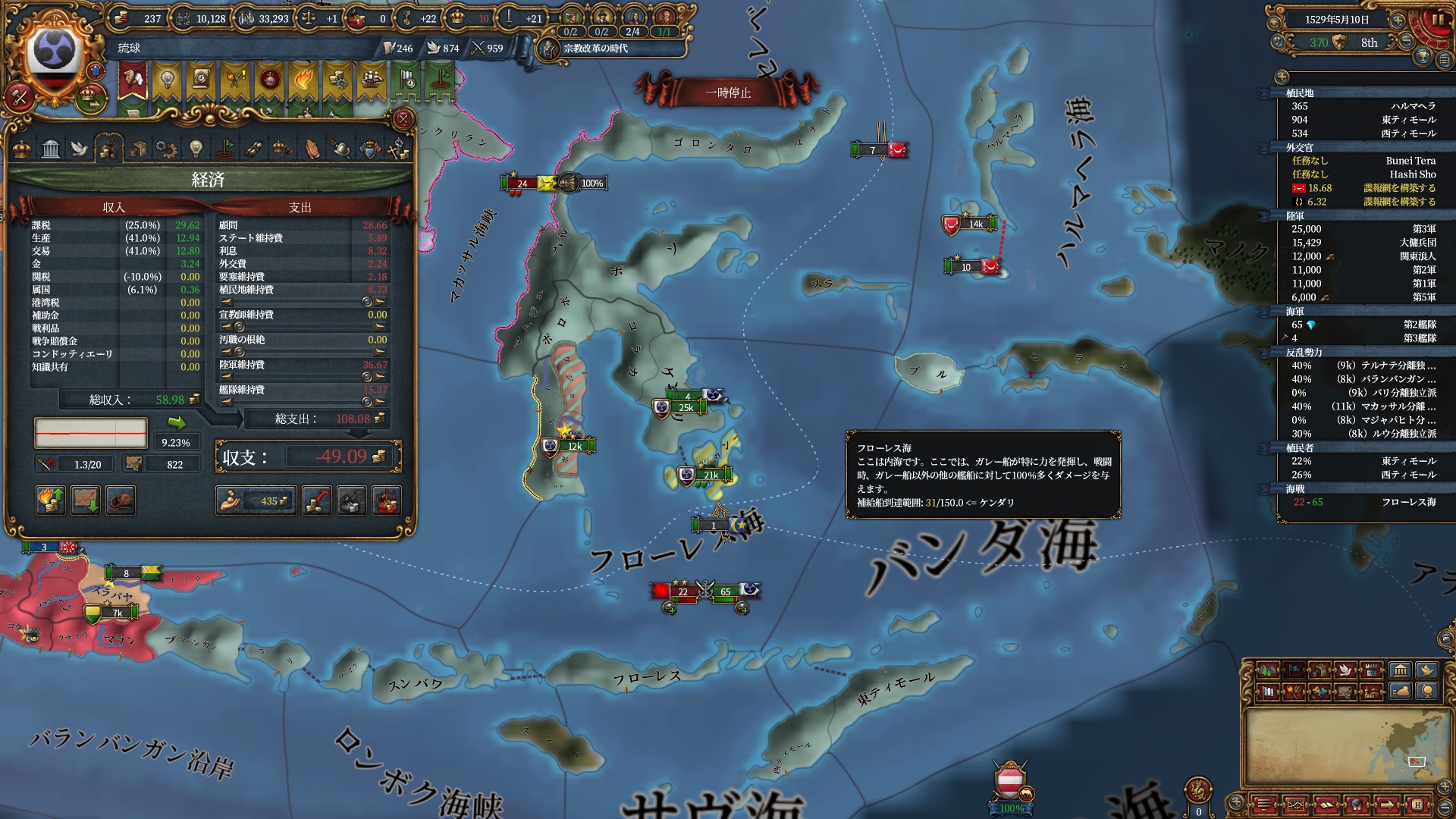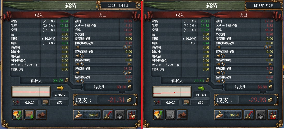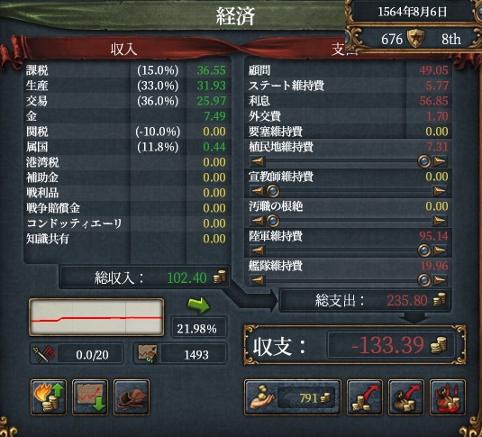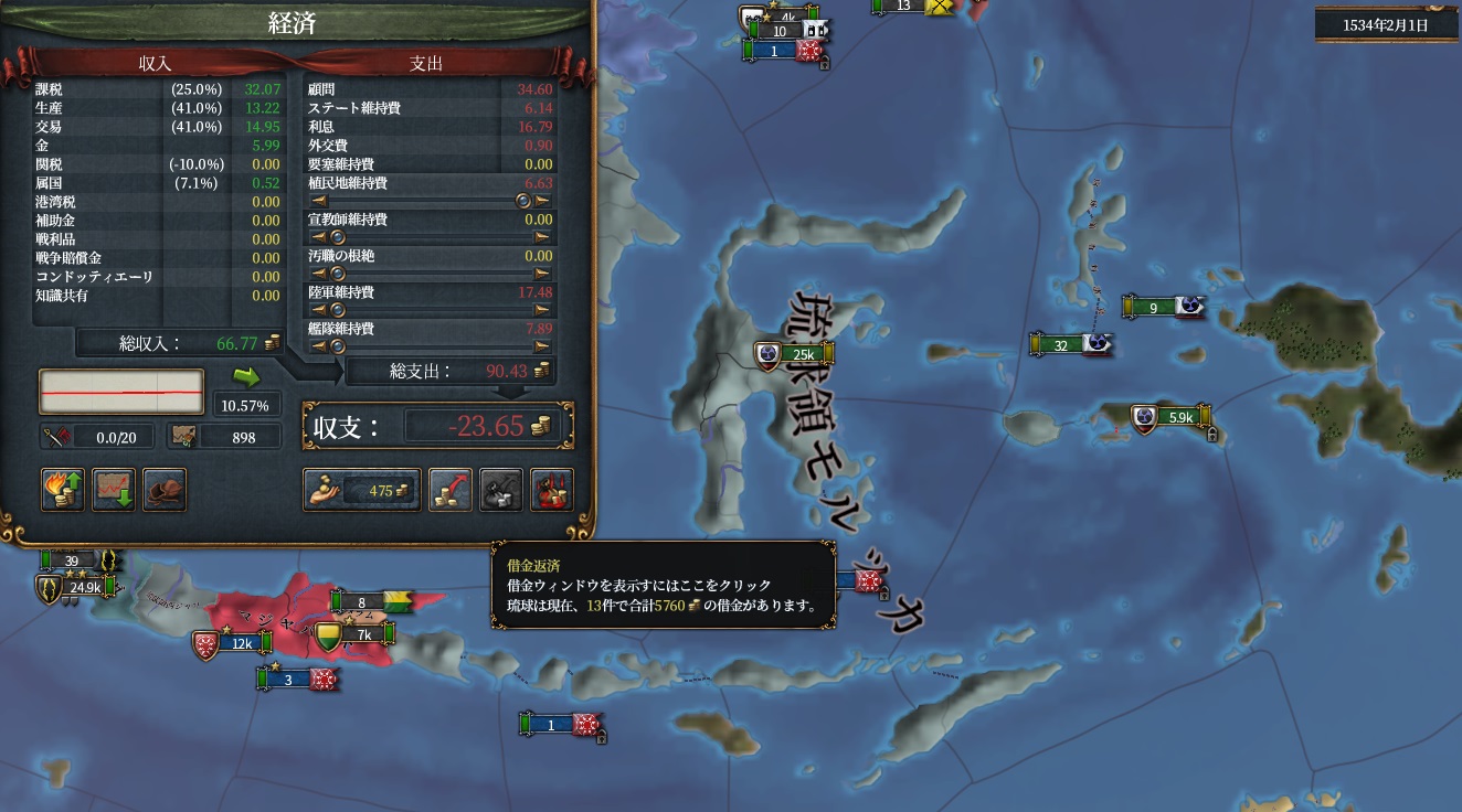 モルッカの征服状態を眺めつつ、現在の収支です。