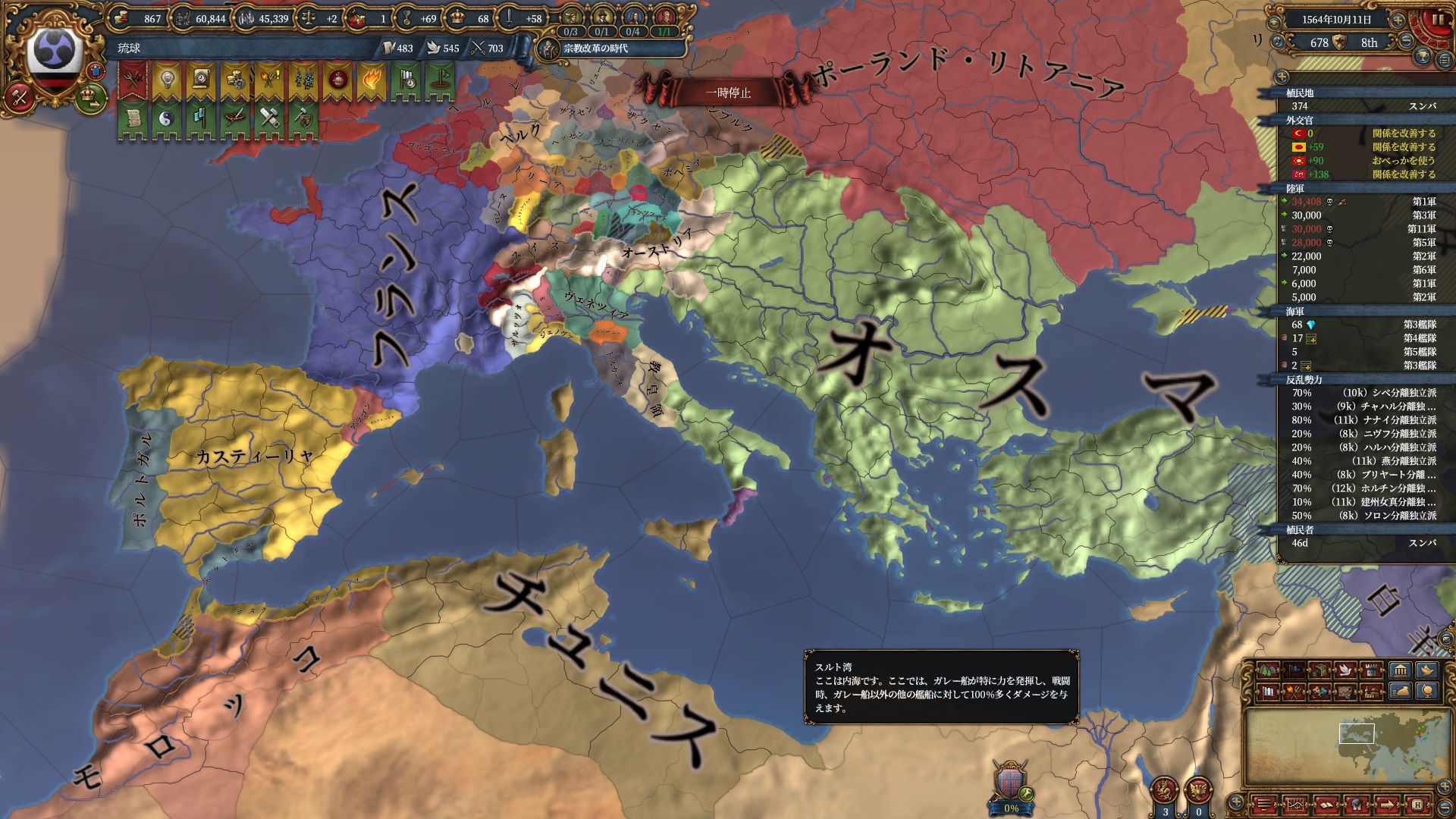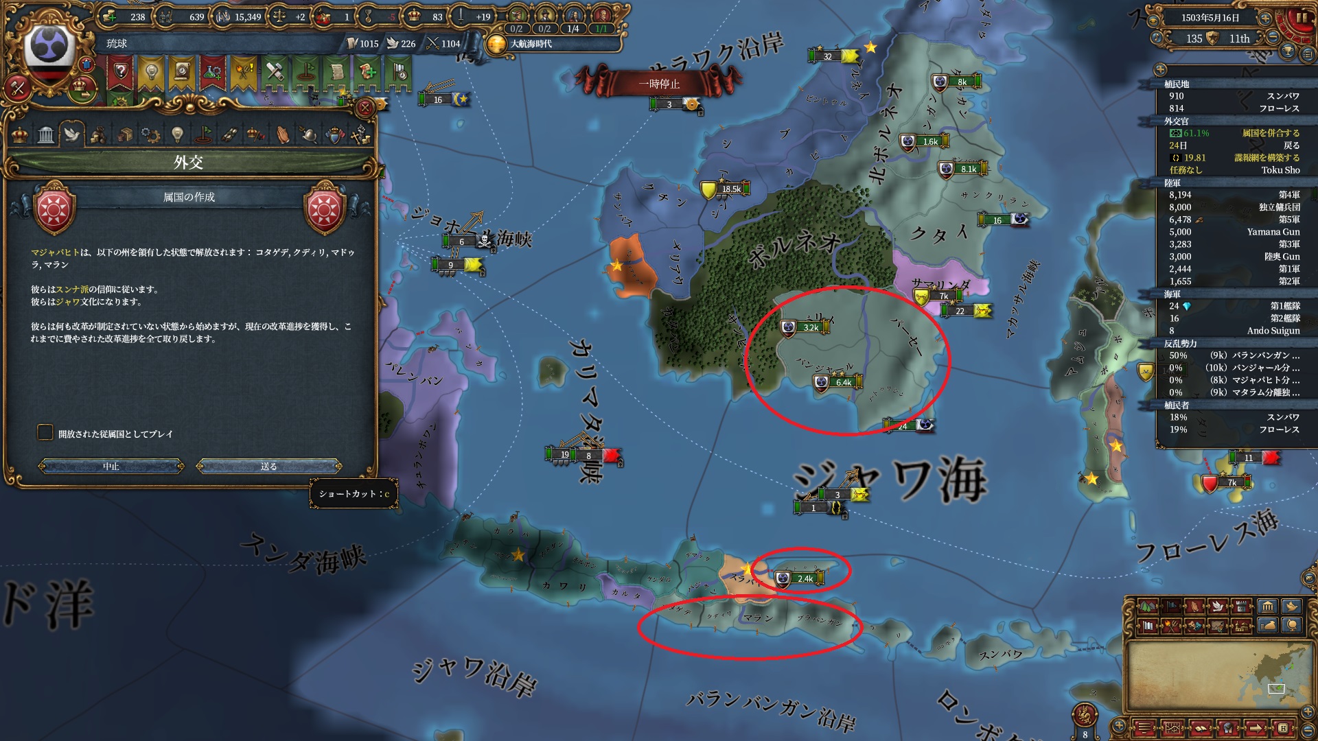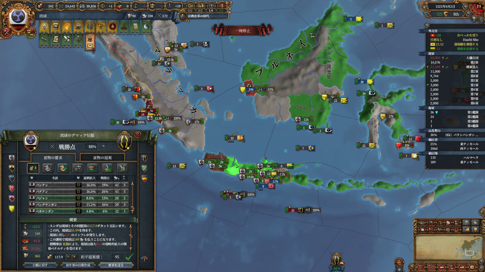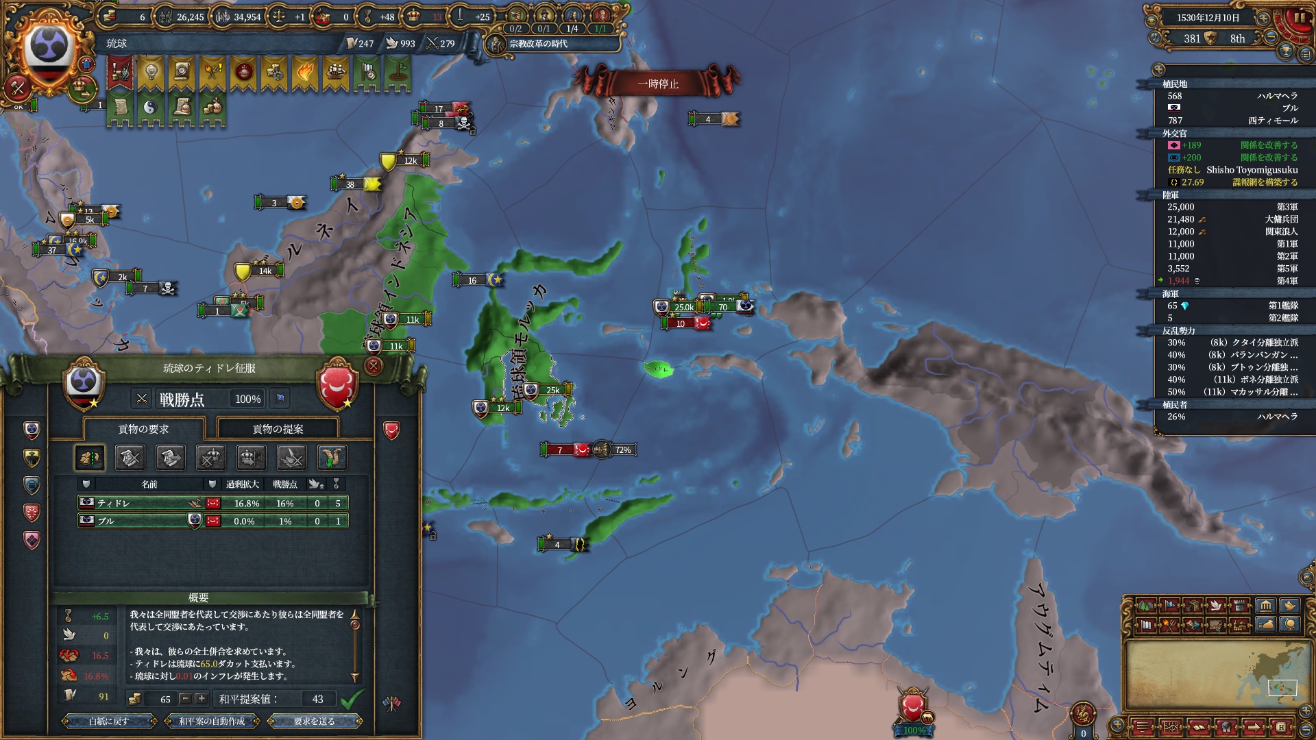 順調に処理。テルナテ・ティドレは属国にすると植民してくれるいい子ですが、産物グローブガチャの邪魔になるんで滅ぼしました。