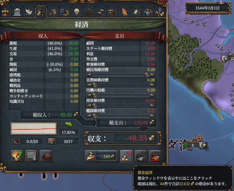 というわけで技術12のタイミングを合わせて1544年に破産します。総収入が85で利息が65なので、あと7000ダカットは借金できましたね。