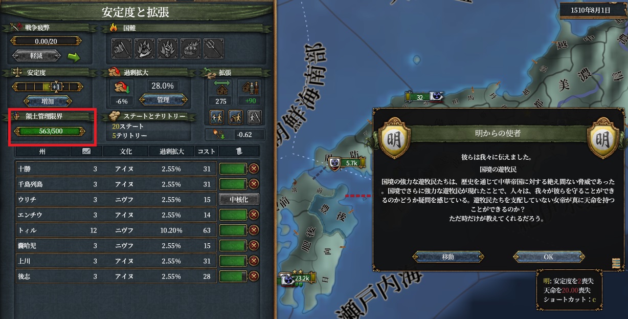 幕府は統治キャパが辛いわけですが、ステートまみれにした結果が上の超過63という結果になります。これを即急に解除したいですね。