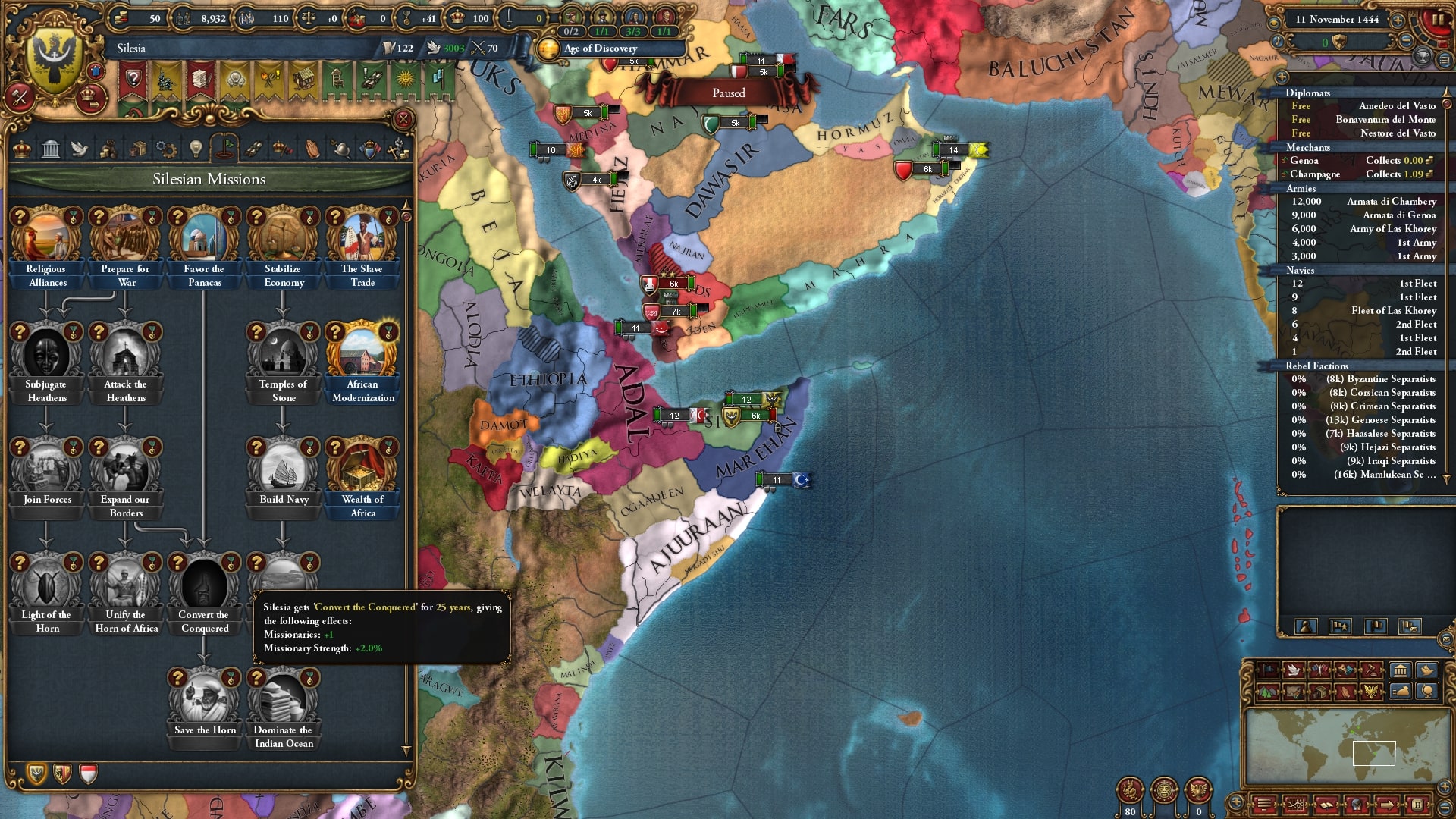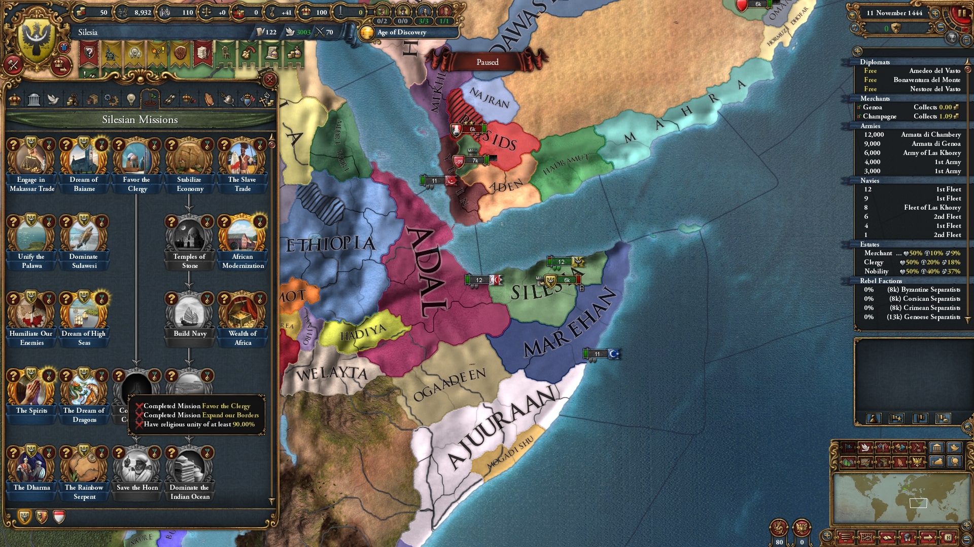 | 宣教師+1 布教強度+2%(50年) | なし | エチオピアミッション3-6 | 『カスル・イブリム州を領有し宗教が自国と同一』 『アレクサンドリア州を領有し宗教が自国と同一』 『アンティオキア州の宗教が自国と同一』 |
