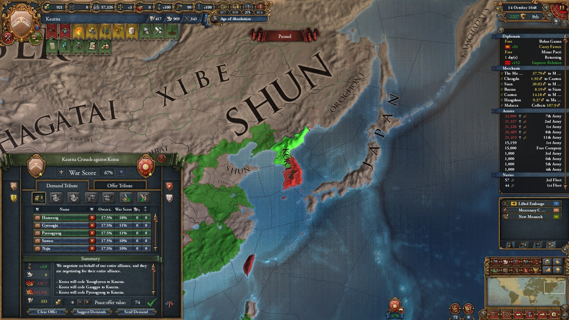 オイラトを使って停戦短縮していました。再びベンガルを連れて順に宣戦、中華皇帝位にようやく就いていたのもありさすがに余裕でした。なかなか領土が獲れないです。