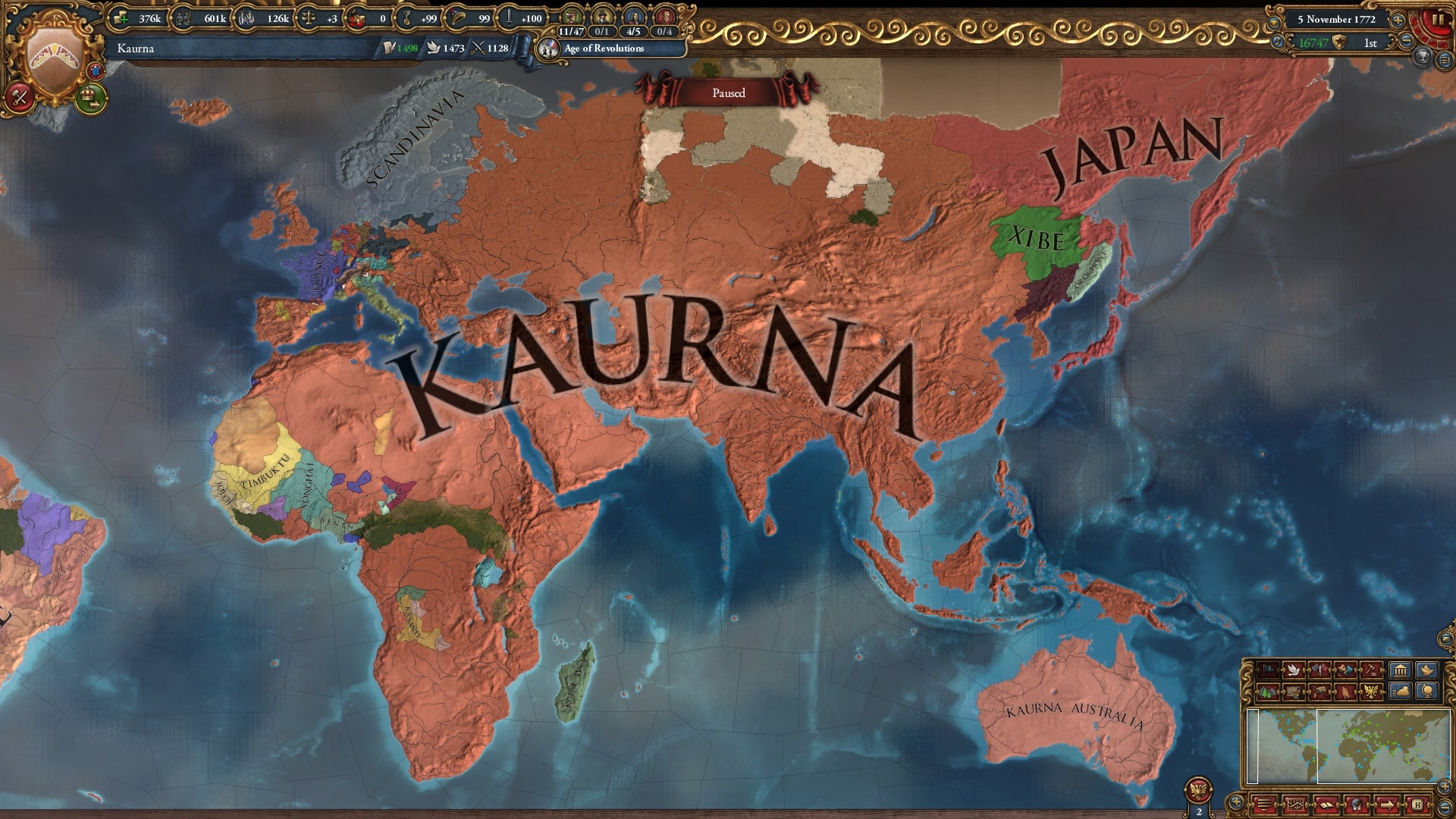 オーストラリア部族でのWCに関してですが、やはり旧大陸側の国家と比べると大変であると言えるでしょう。一番国力を伸ばしたい16世紀はオーストリアからの旅立ちと東南アジアでちょっと拡大することに費やされてしまい、ある程度中規模な国家が誕生し始める1600年頃にようやく中途半端な国力で旧大陸に進出することになりますので、厳しい戦争を長く繰り返す必要があります。前回プレイしたオマーンのように『序盤だけしのげば中盤は何とかなる』とはいかないのが難しいところだと思います。終盤のラッシュはリアル厭戦が大きな敵、これは全国家共通ですが。遊牧民政体を使える点と、ガウナNIのコア化コスト-20%が大きな救いでした。