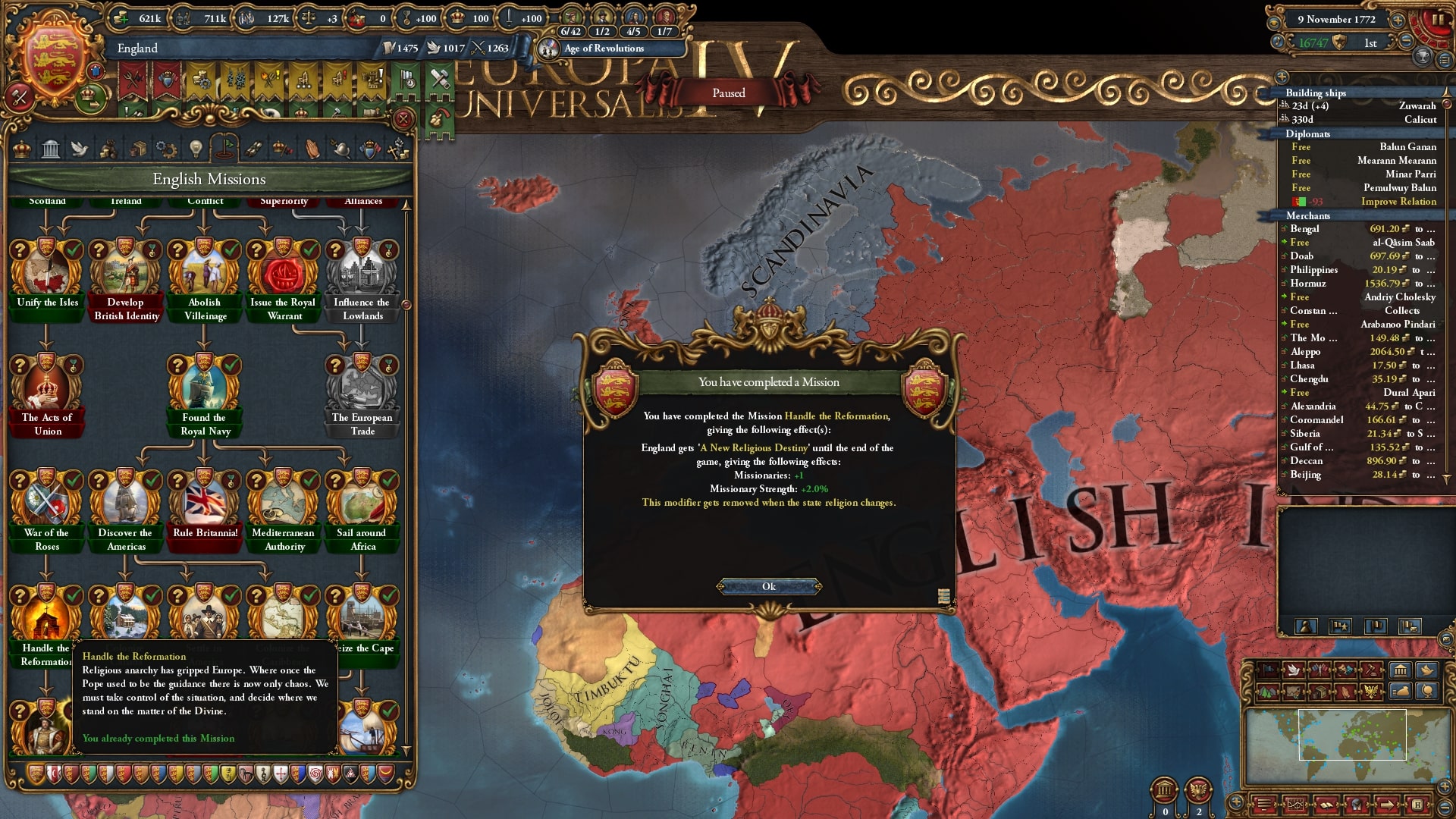 1811年、強制改宗させ残していた南アフリカ国家を併合したことで世界征服を達成。すでに残りの州すべてに宣教師が入り、改宗終了待ちの状態です。