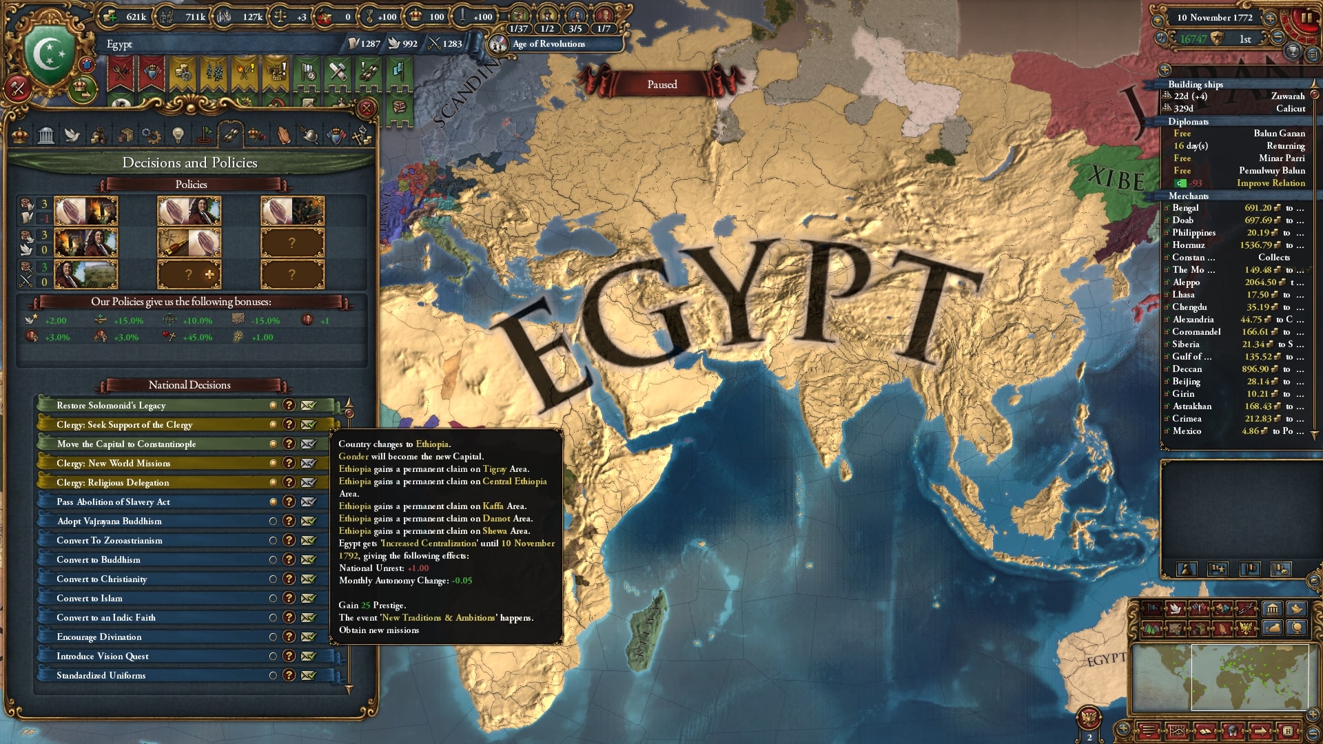 そこで、まずは世界各地に改宗用の衛星国を建国し、それでも足りなかったら交易保護国を建て改宗する方針としました。結果的には衛星国を9か国ほど建国、交易保護国に頼ることはありませんでした。
