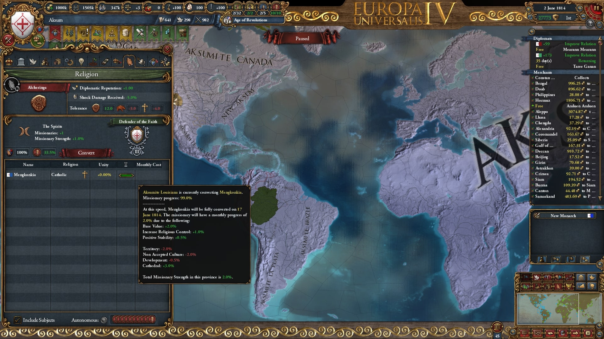 1814年6月、アクスム領ルイジアナ植民地が最後の異教州を改宗したことにより、ついにアルチェリンガによる宗教統一を達成できました。