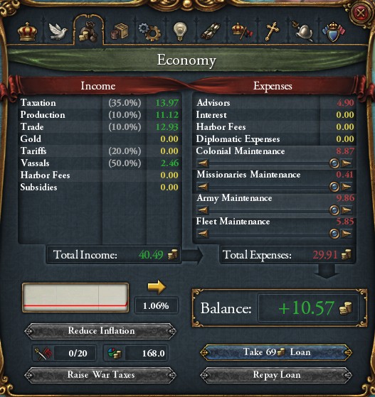 3つの植民地の同時運営による10D近くの費用、更に属国の併合で増える陸軍維持費を差し引いてもなお月収10D近くが確保できています。