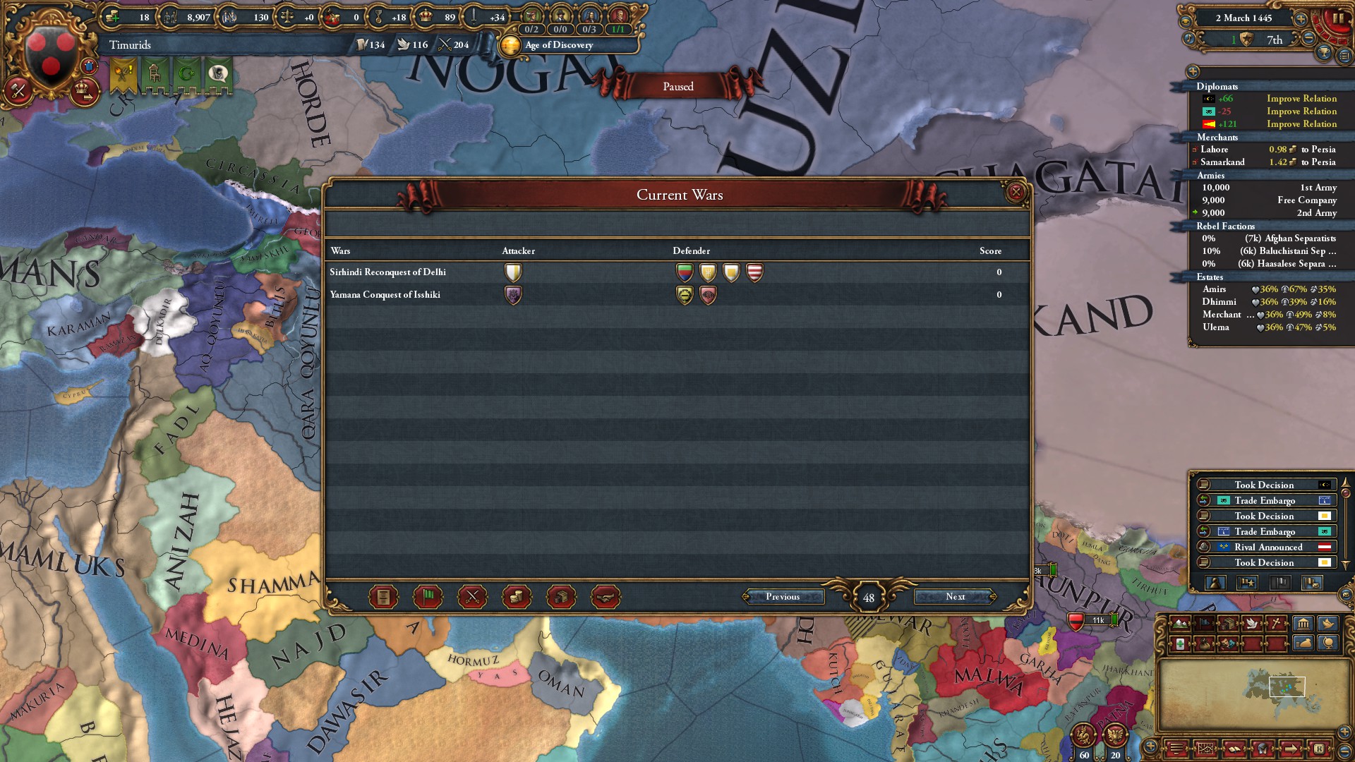 ・マムルーク、ウズベク、デリー(後に外れる)をライバル指定+禁輸+侮辱