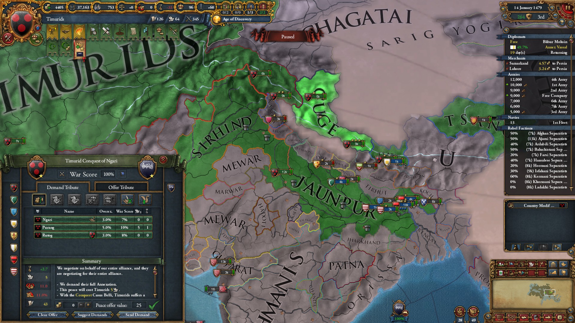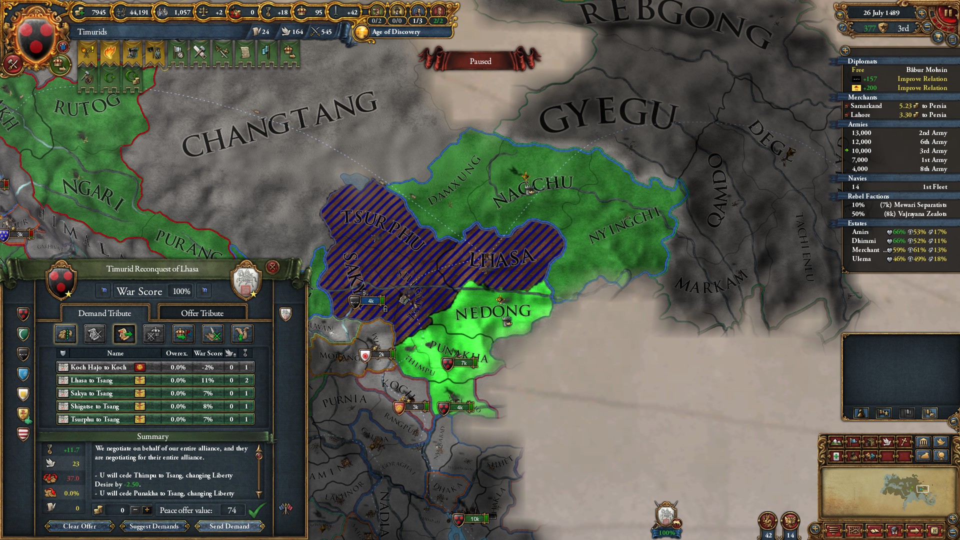 Gugeを全土併合しました。ツァンのコアを持つ国は戦争中に白紙和平しました。