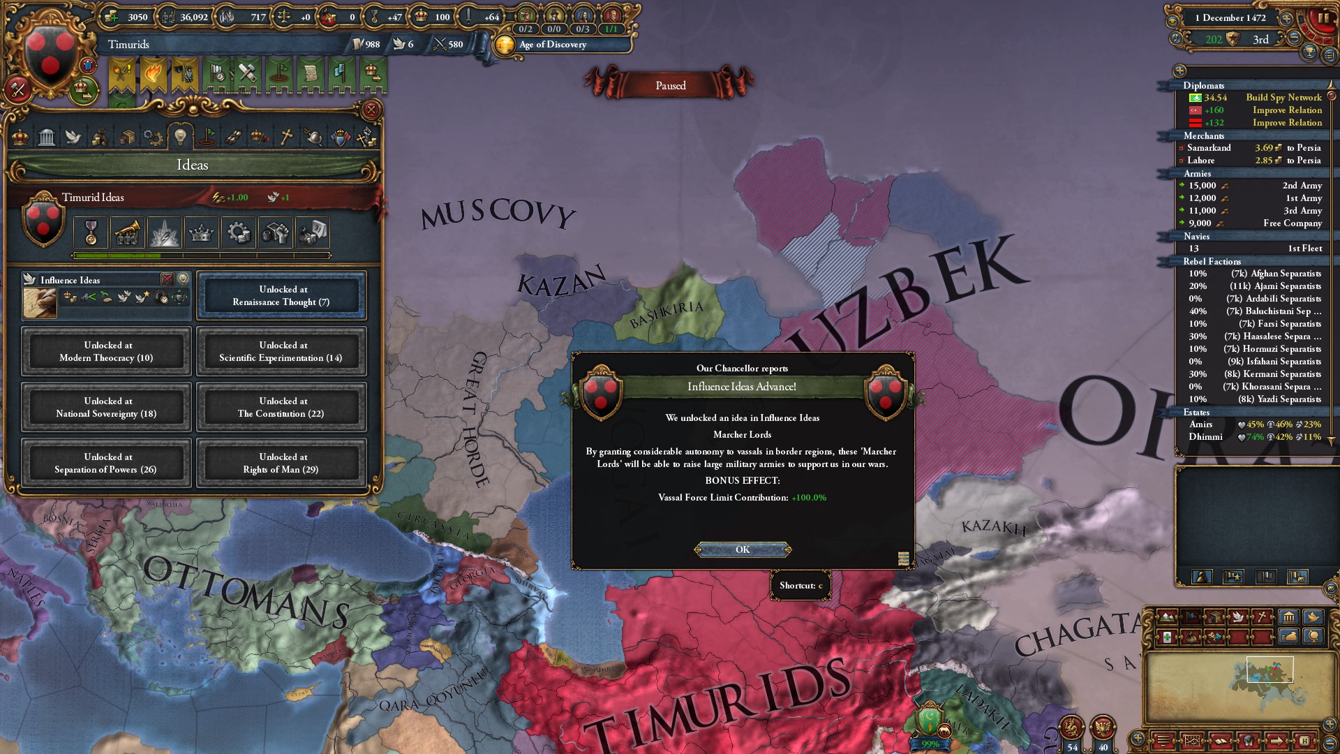本AARでは、ティムールの状態から教信者の反乱を誘発させていますが、必ず先にムガル変態のディシジョンを押してから国教を変更しましょう。