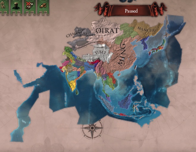 東南アジアには大越、ランサン、シャン、アユタヤがいる。マラッカとブルネイはマラッカ国家精神グループに属していて、これが7に達すると植民者を得るから要注意だ。チベットは専制君主によって統一されており(のち神政に移行)、インドは群雄割拠。この世界ではだれがインドを統一するのか、まだわからない。