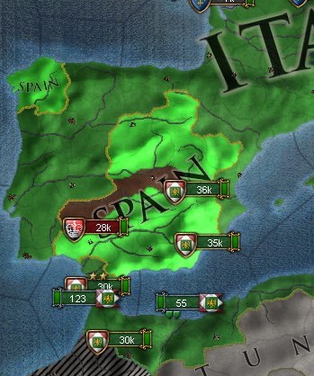 時間経過で戦勝点がたまるのを待つことにした我が国はイベリアに目を転じ、残してあったLeon・Cataloniaに並行宣戦します。