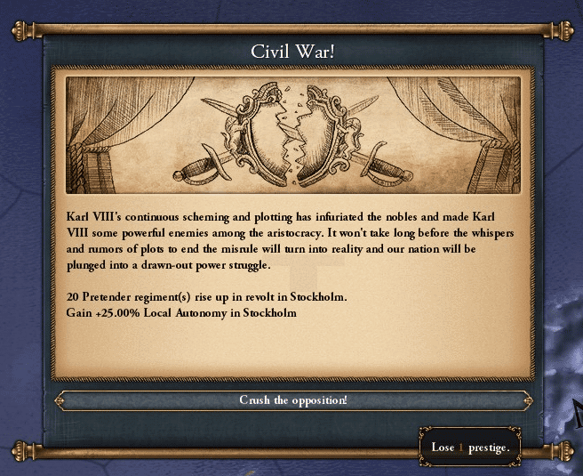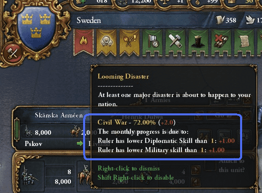 カール八世陛下の場合、DIPとMILがともに0のために一気にCivil Warの可能性が高まっていると。