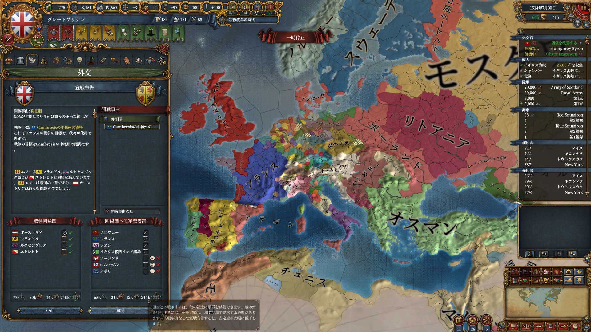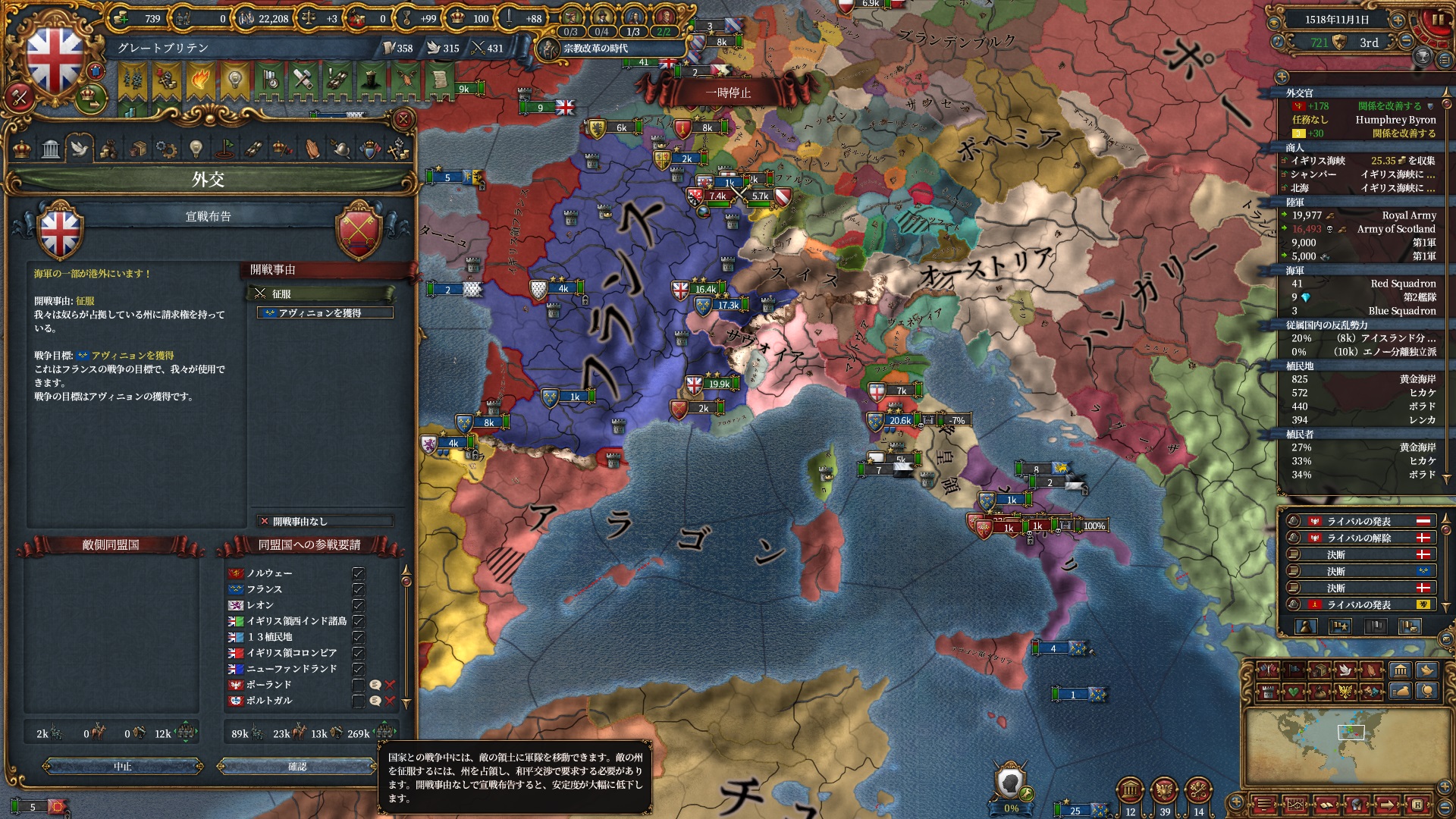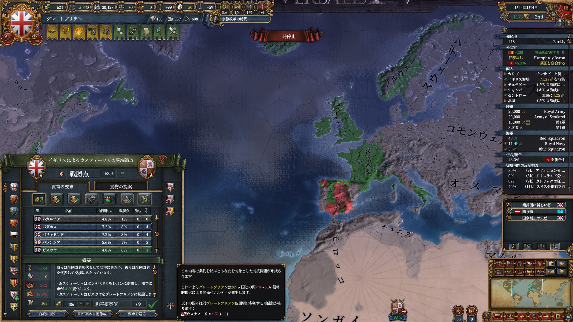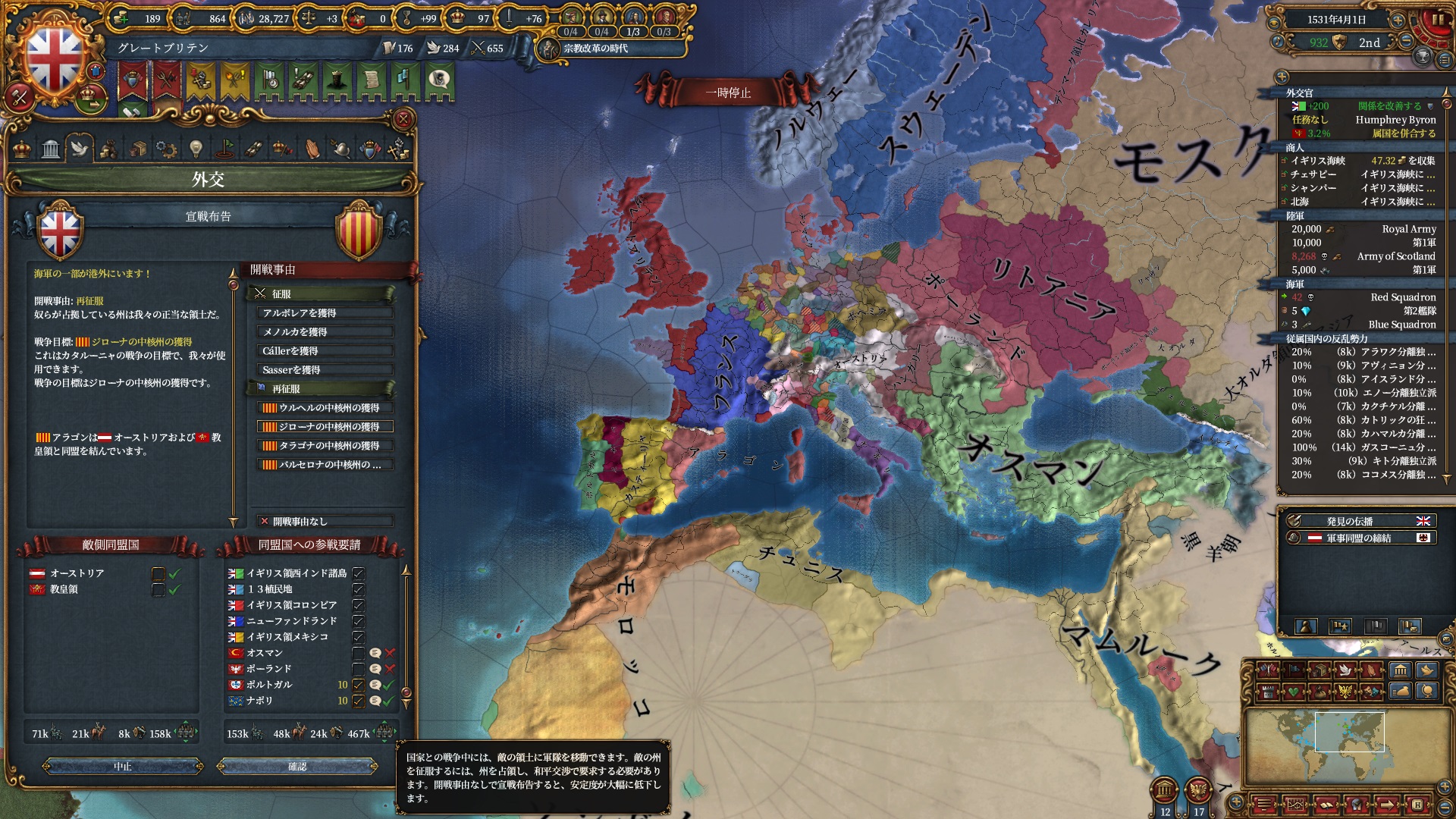 完全に消し切るまで時間がかかるカスティーリャ・ポルトガルはずっと包囲網候補として計上されるどころか、今回アラゴンまで入ってきているので欧州の拡張はなるべく無理しないようにしたいところです。