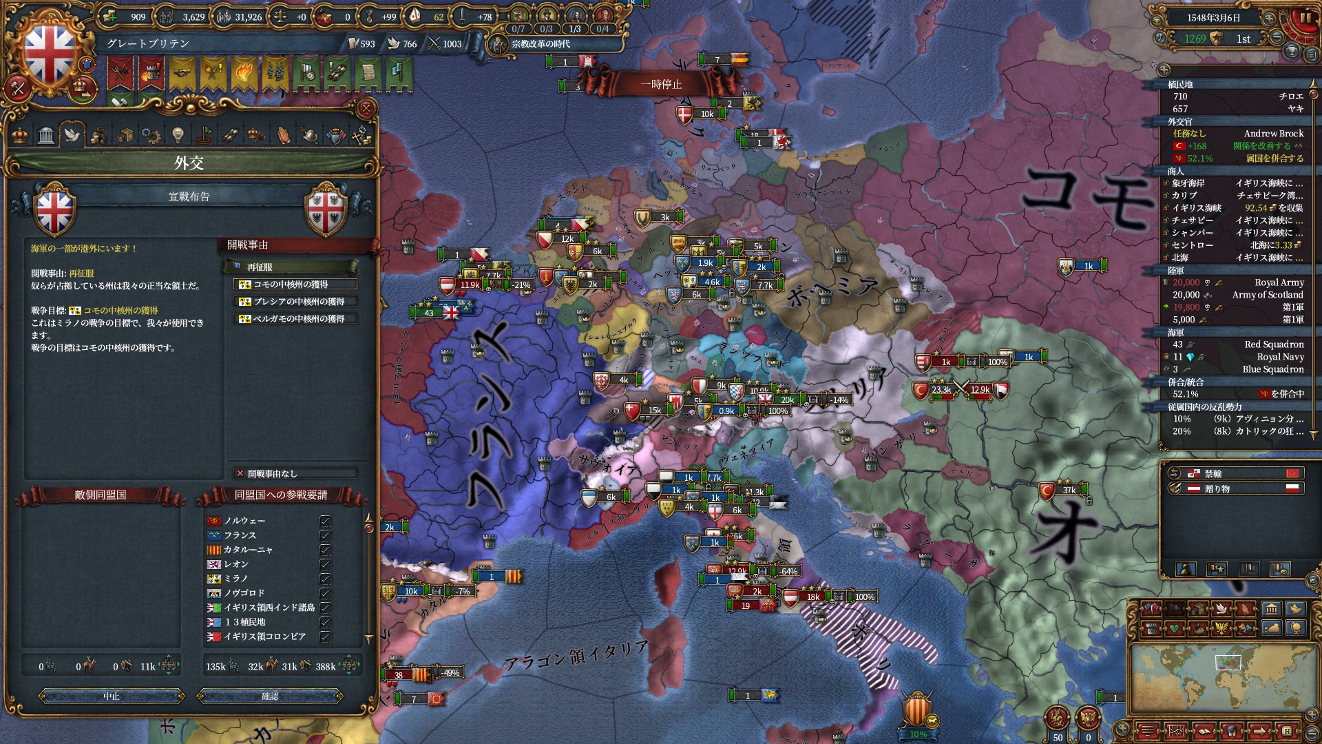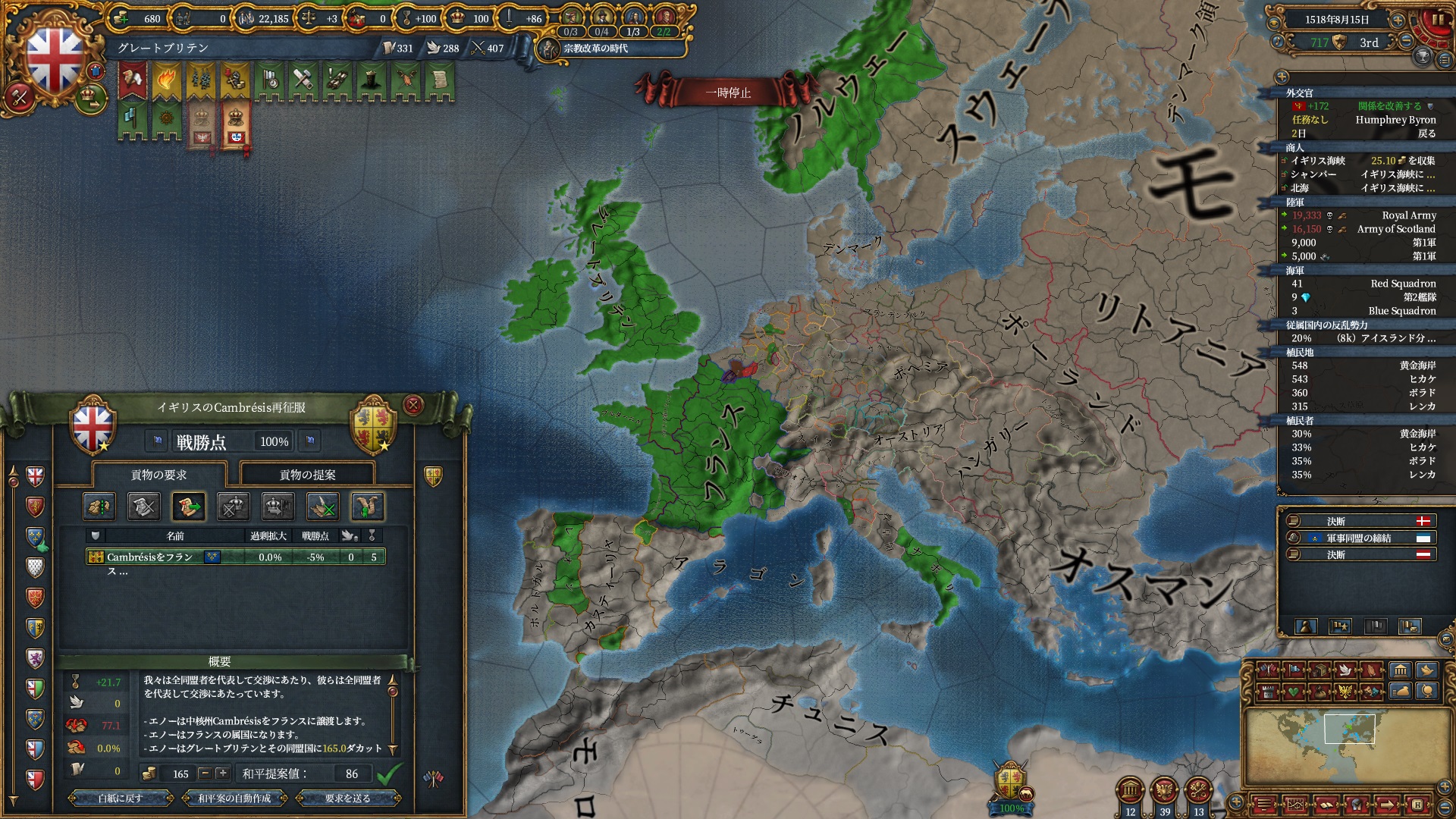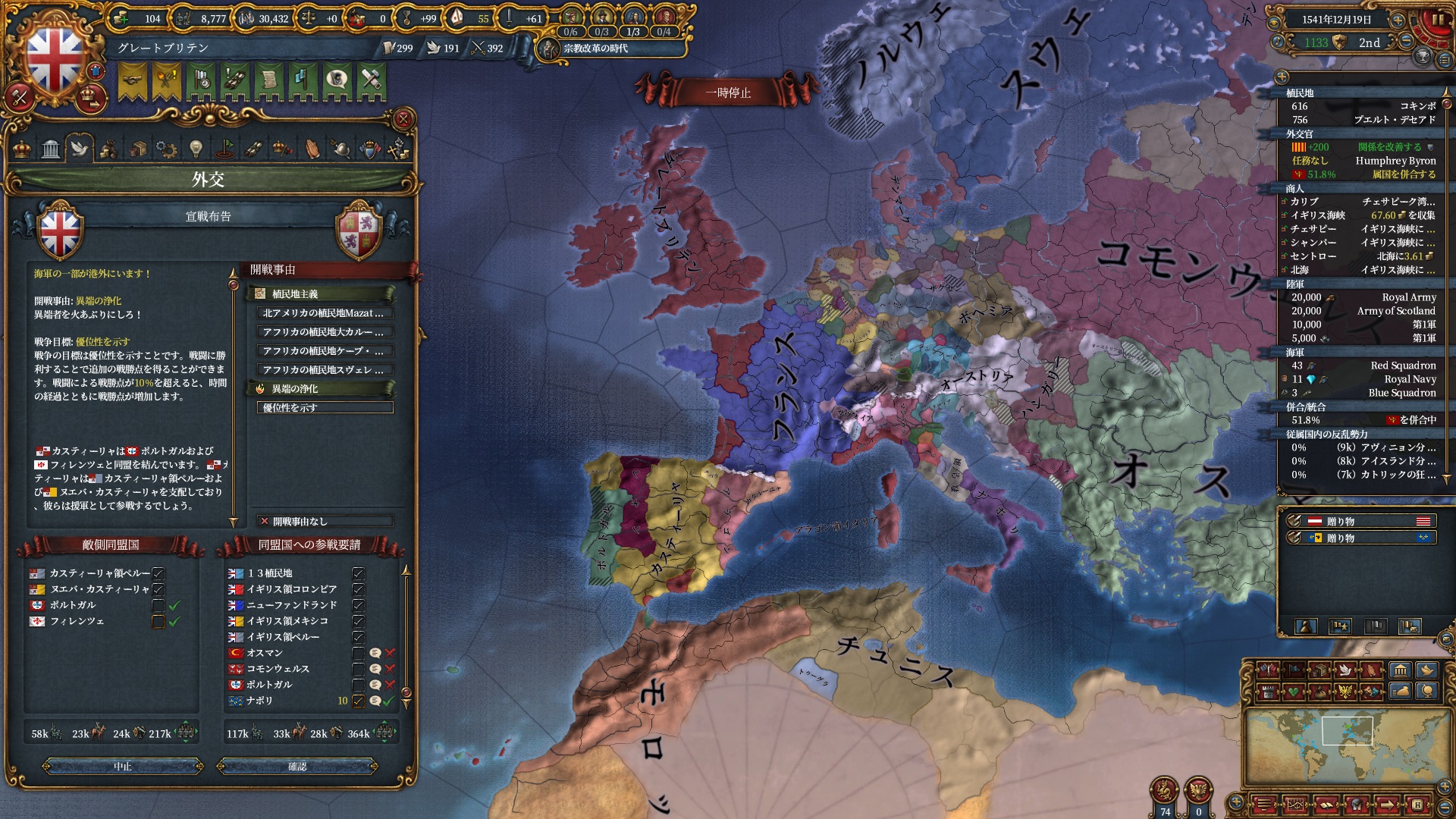 完全に消し切るまで時間がかかるカスティーリャ・ポルトガルはずっと包囲網候補として計上されるどころか、今回アラゴンまで入ってきているので欧州の拡張はなるべく無理しないようにしたいところです。