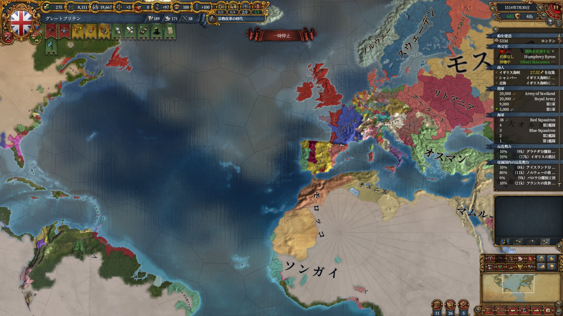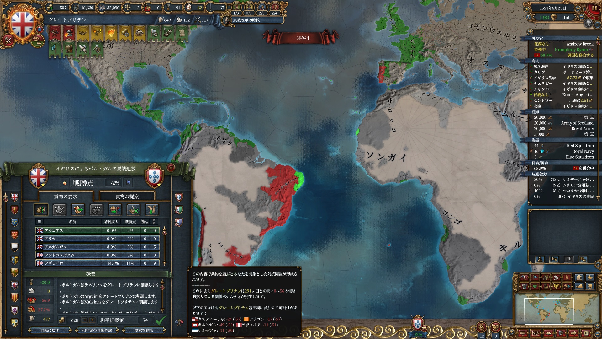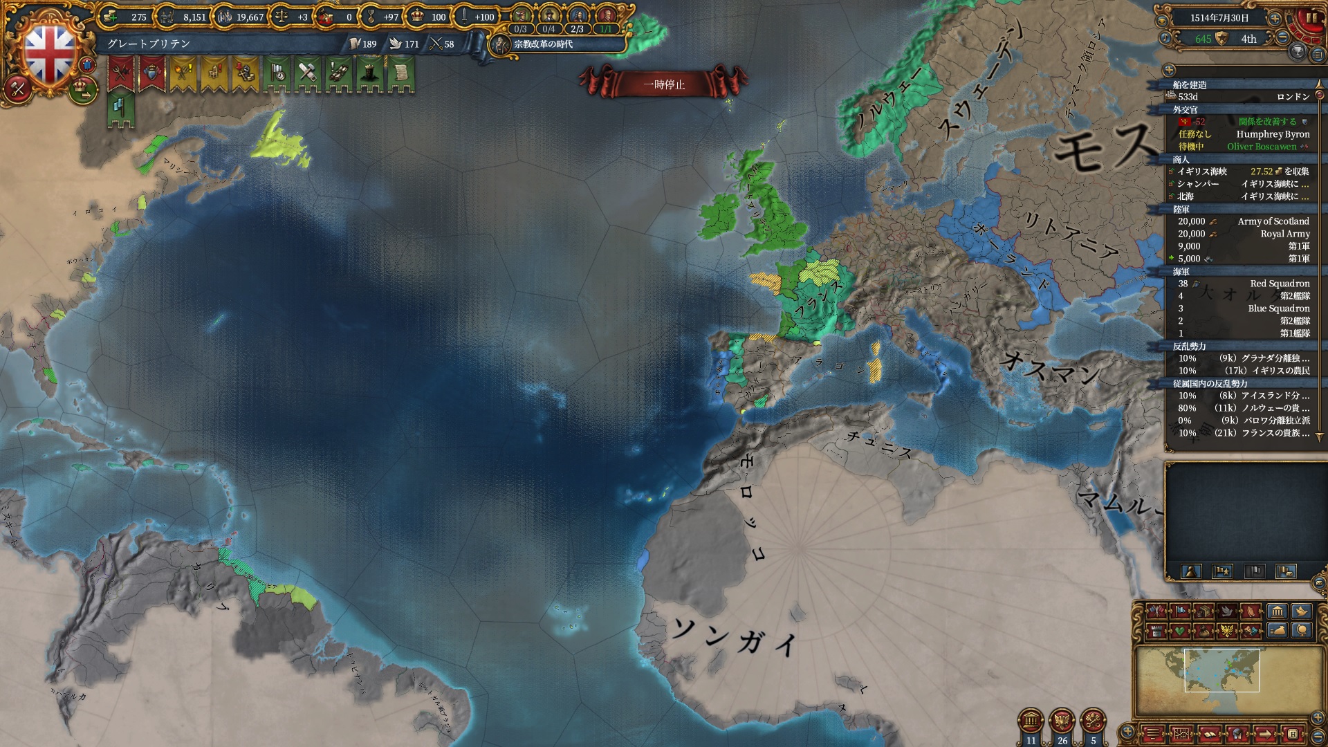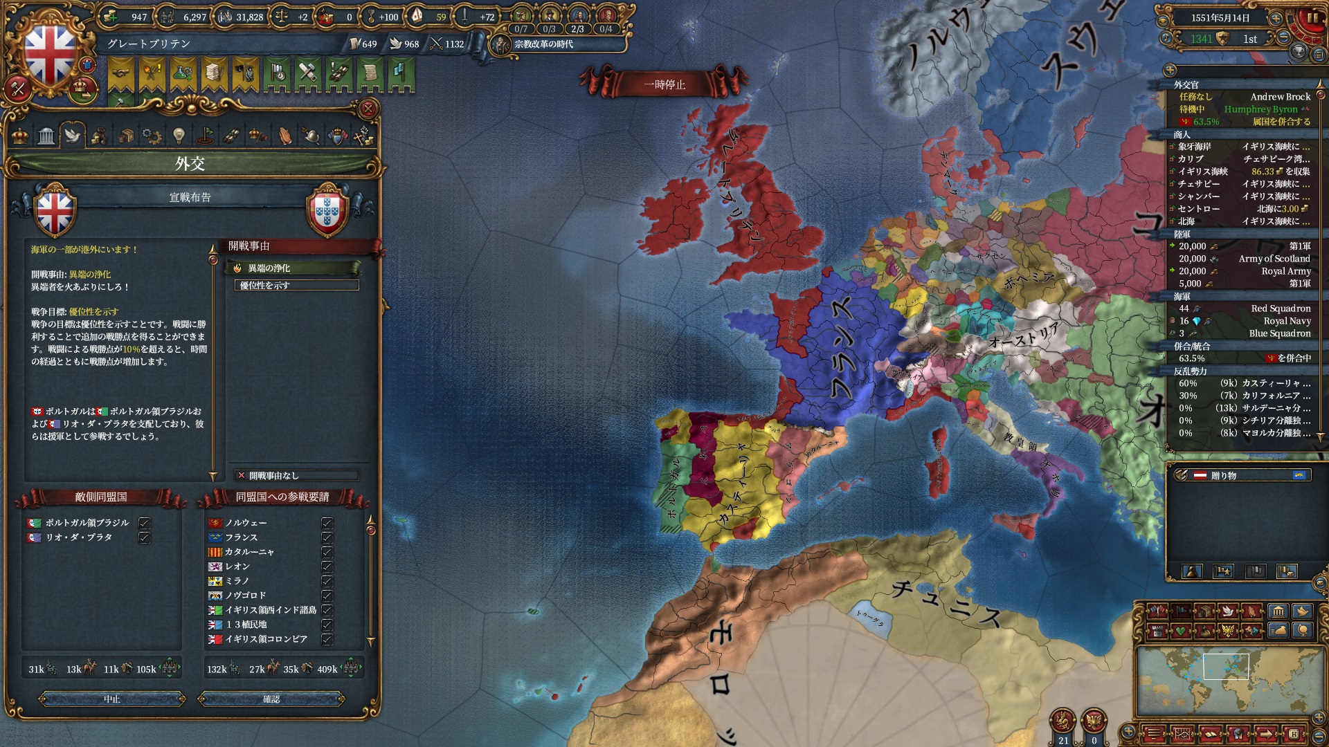 完全に消し切るまで時間がかかるカスティーリャ・ポルトガルはずっと包囲網候補として計上されるどころか、今回アラゴンまで入ってきているので欧州の拡張はなるべく無理しないようにしたいところです。