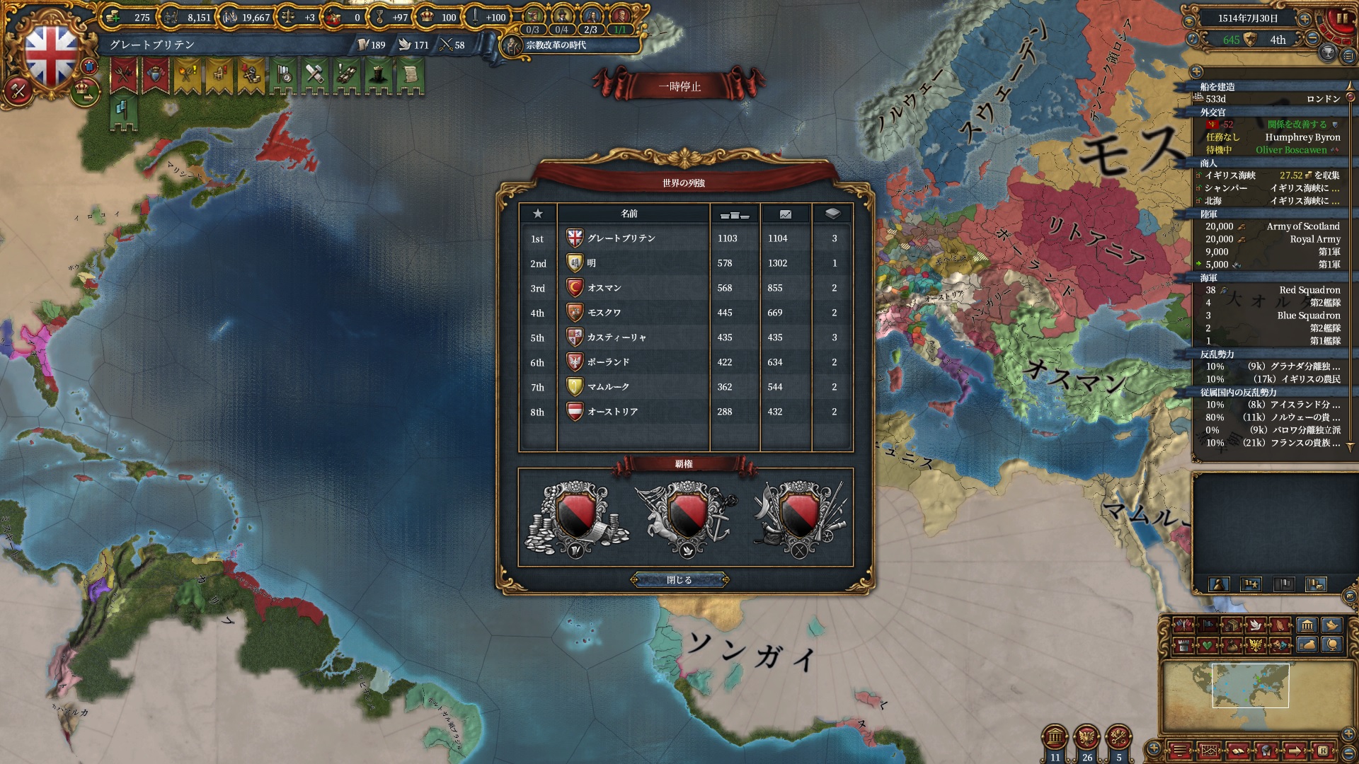 以降は停戦明けの度になるべくオスマンより早くマムルーク宣戦を行った上で呼び出し、オスマンの拡張をうまく妨害しつつこちらの土台を作っていくのが当面の目標です。