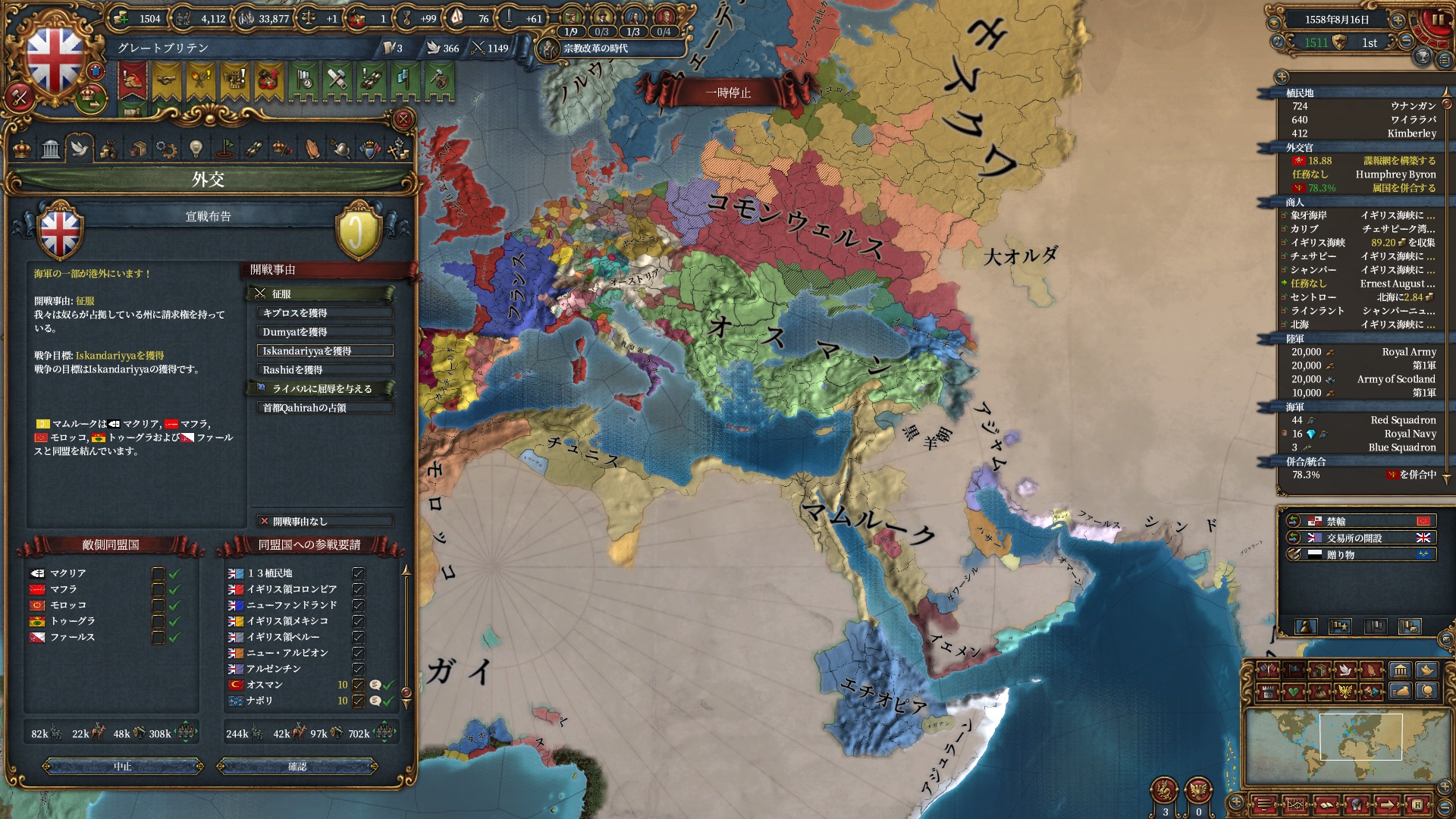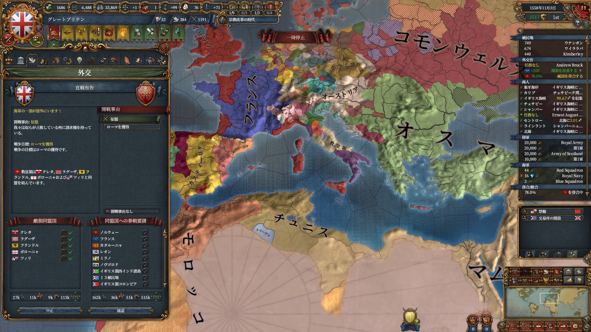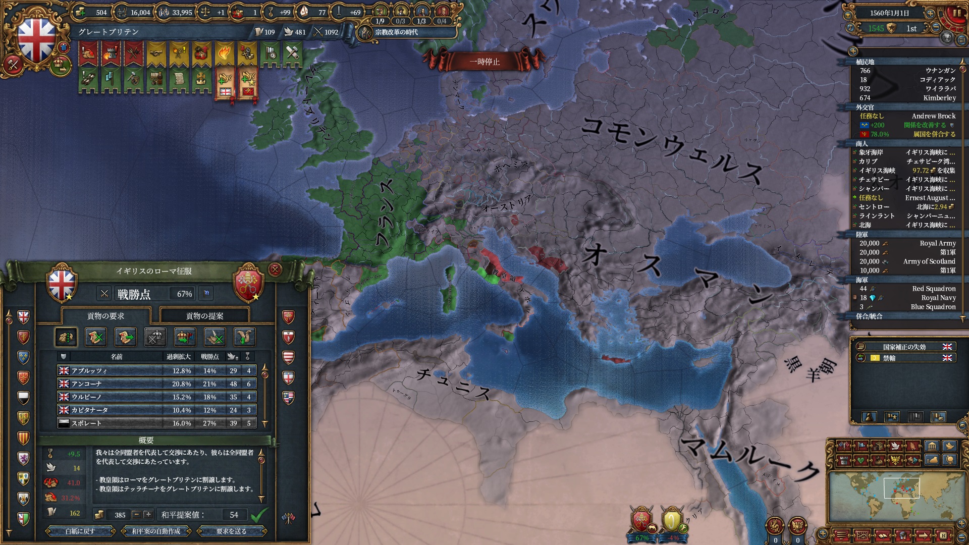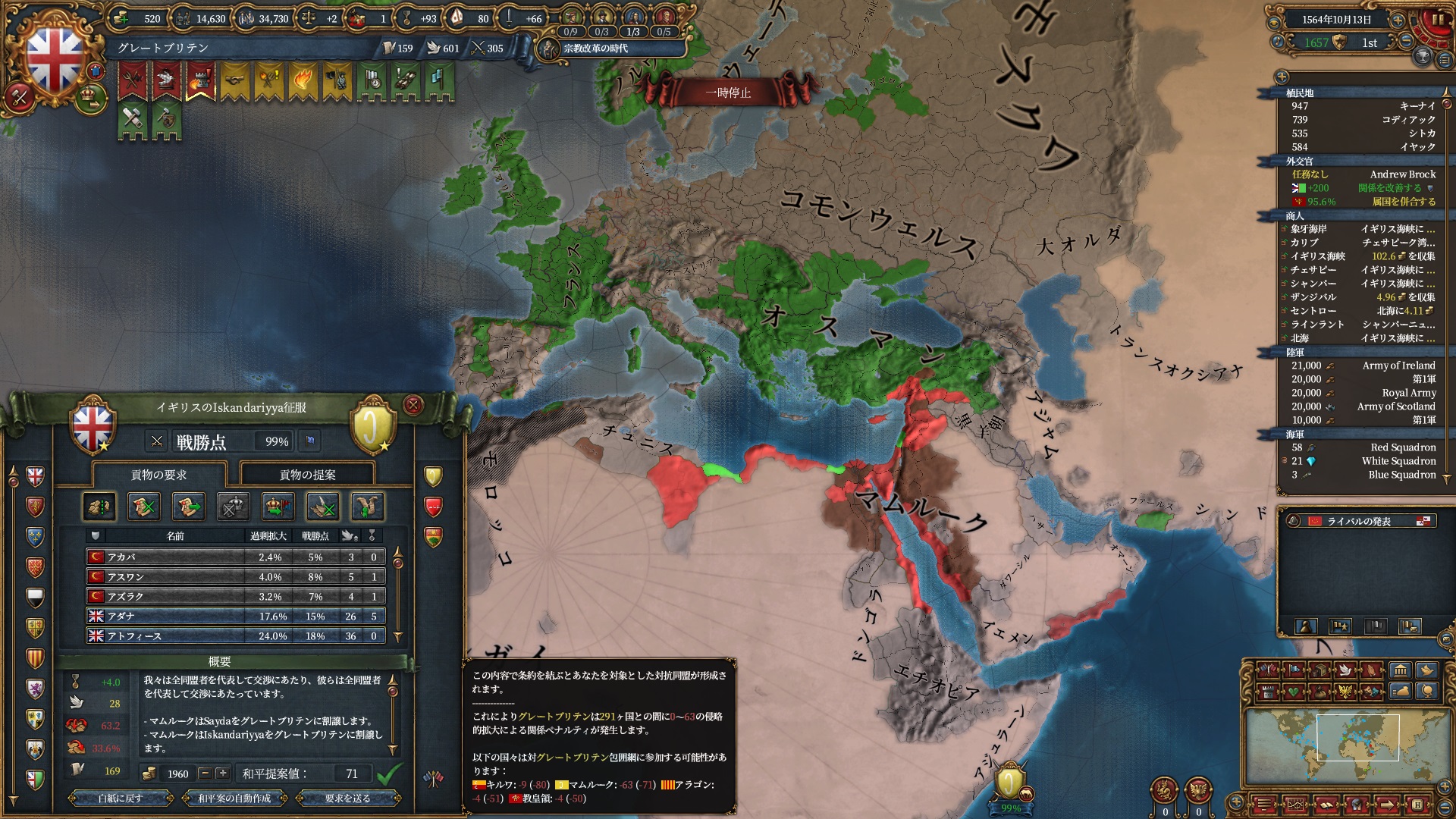 戦争自体はスムーズに進んではいたのですが、評価点の関係でオスマンから同盟が切られそうになったため慌てて講和→大きなマイナス点の源となっているライバル認定されたコモンウェルスの同盟破棄としています。