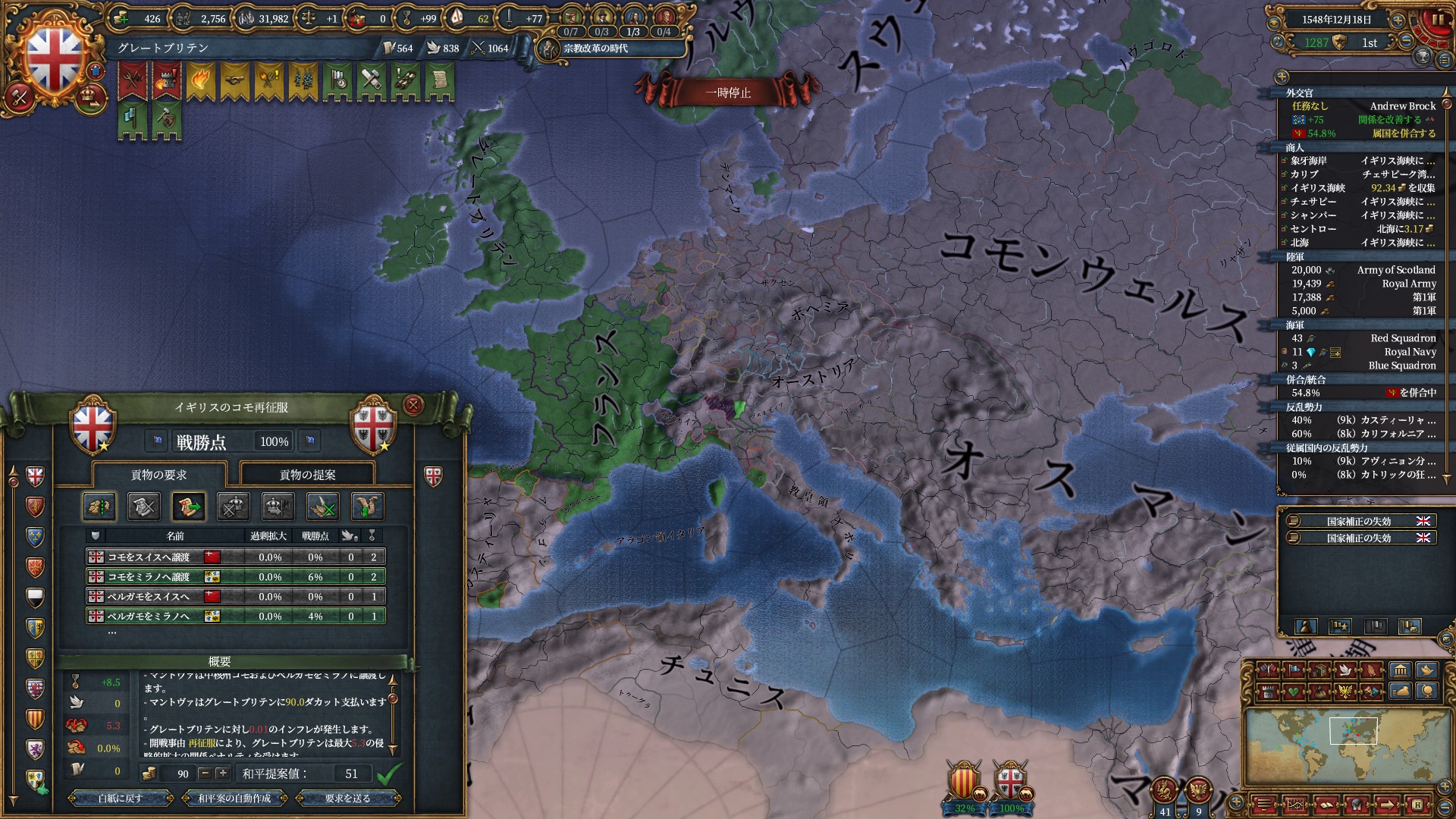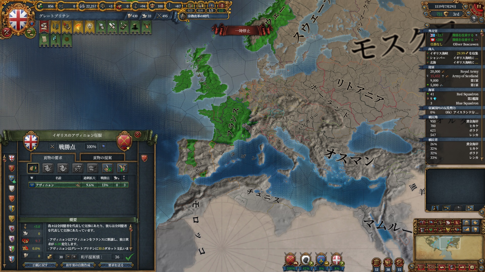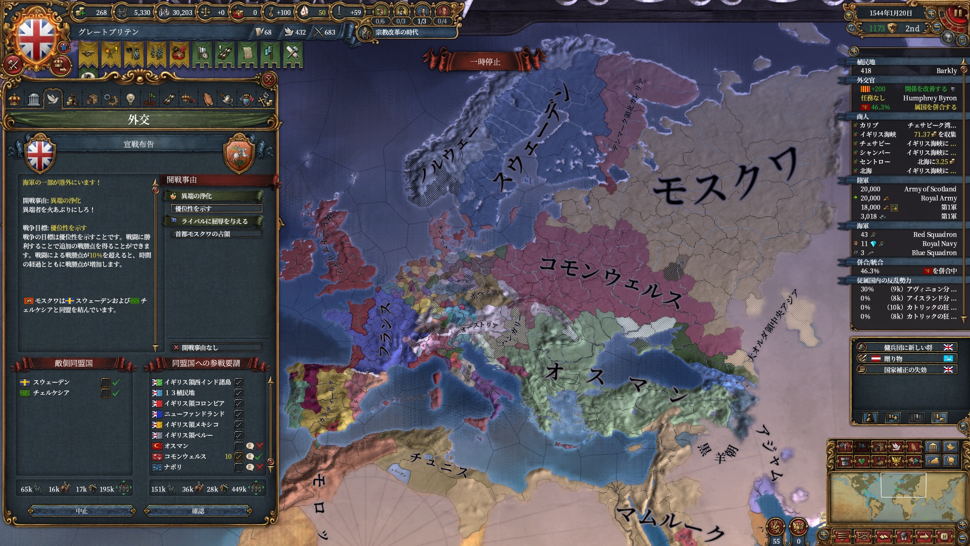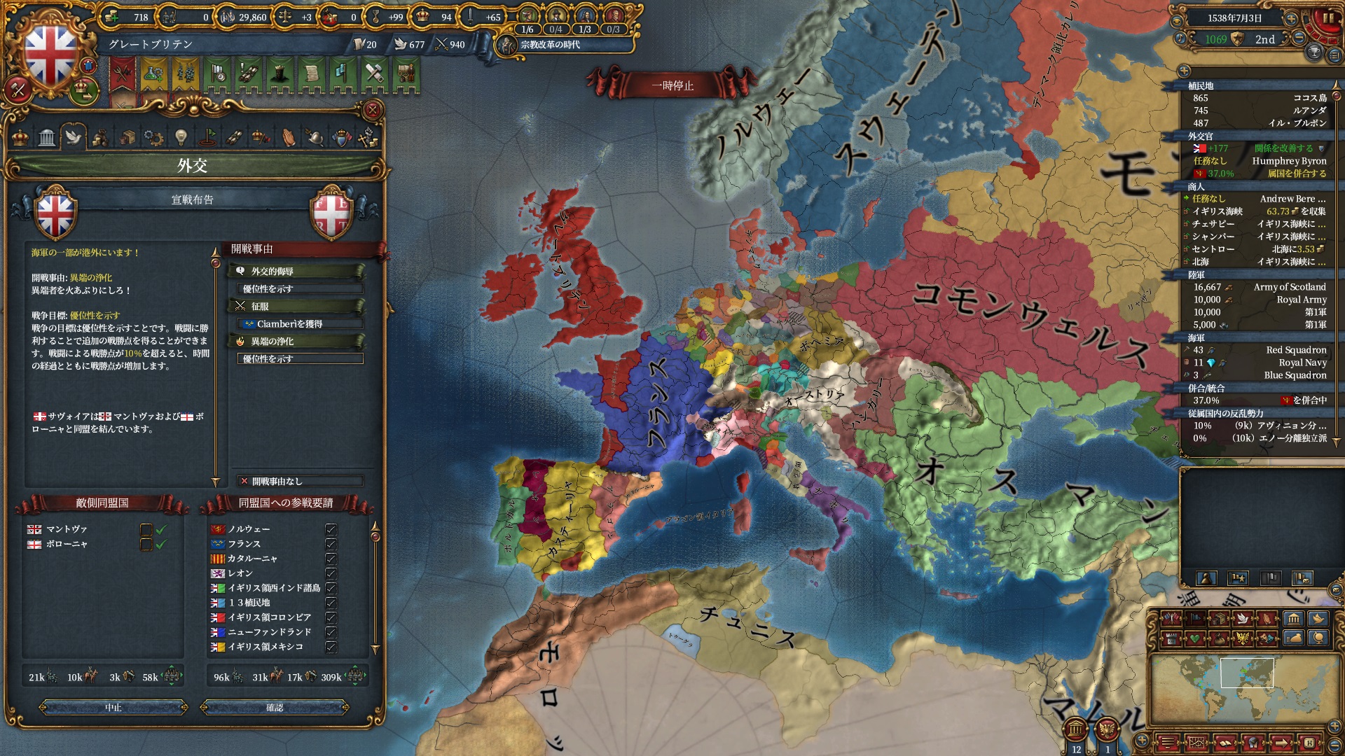 戦争自体はスムーズに進んではいたのですが、評価点の関係でオスマンから同盟が切られそうになったため慌てて講和→大きなマイナス点の源となっているライバル認定されたコモンウェルスの同盟破棄としています。