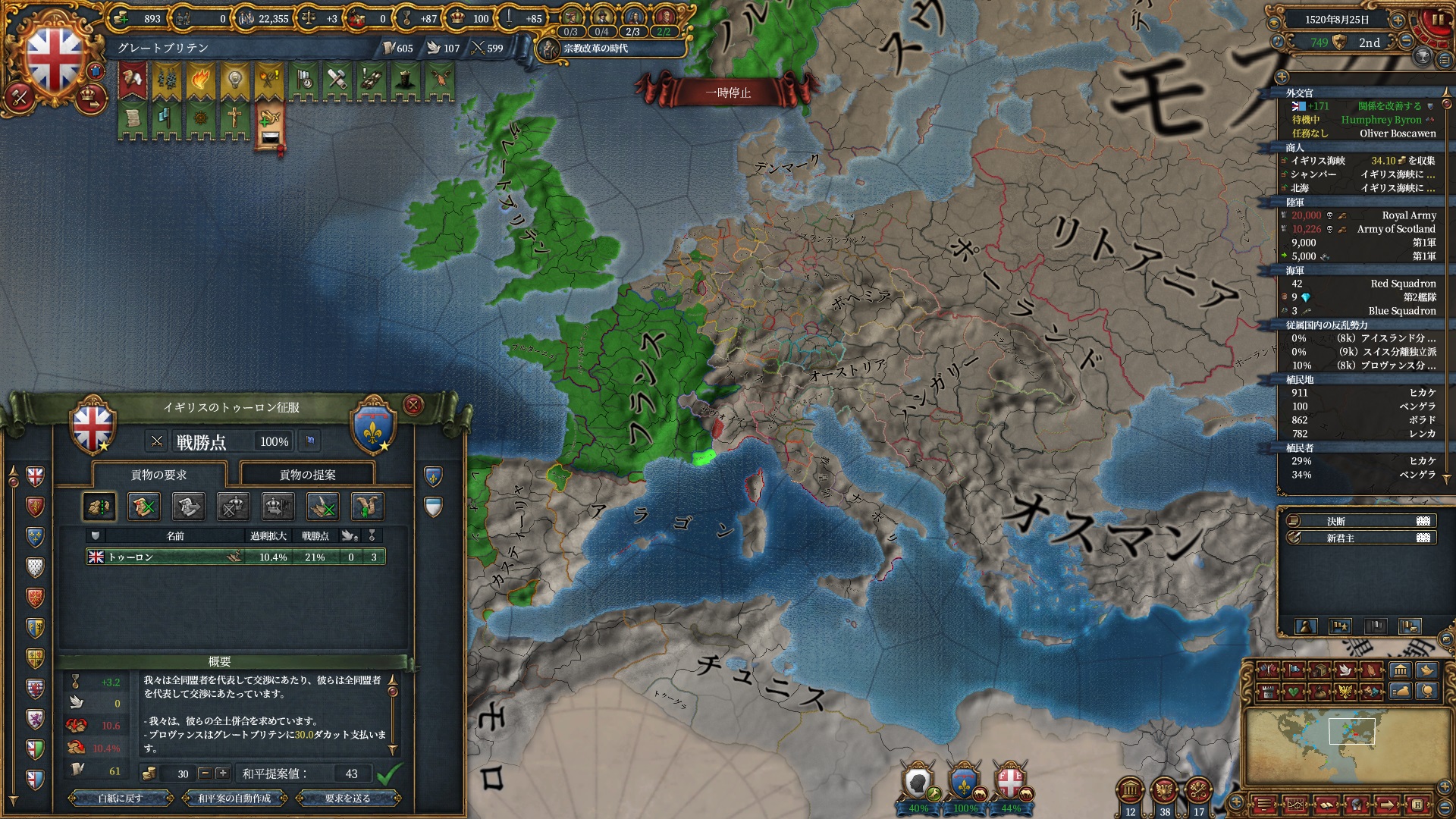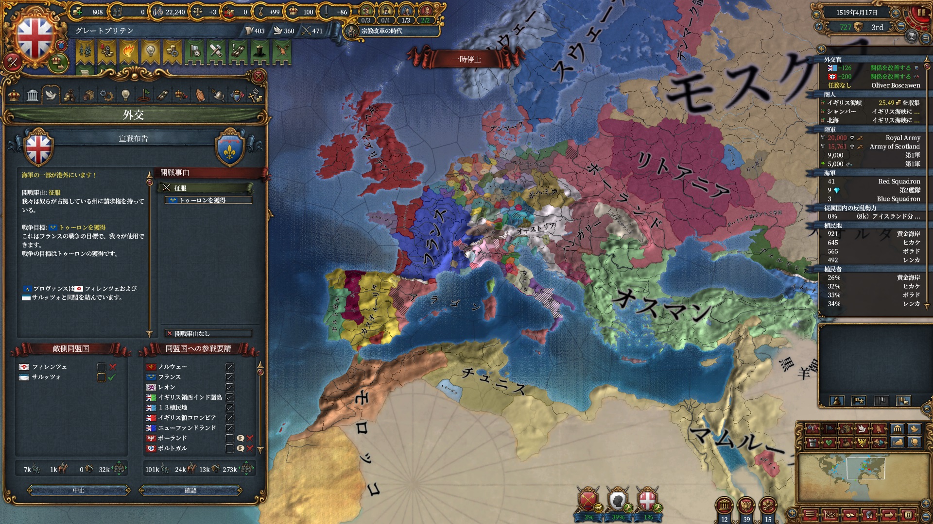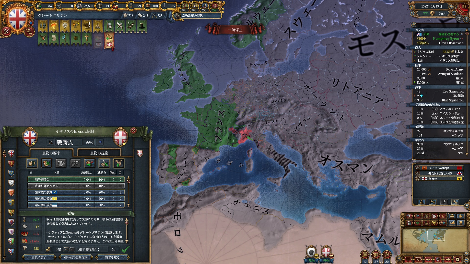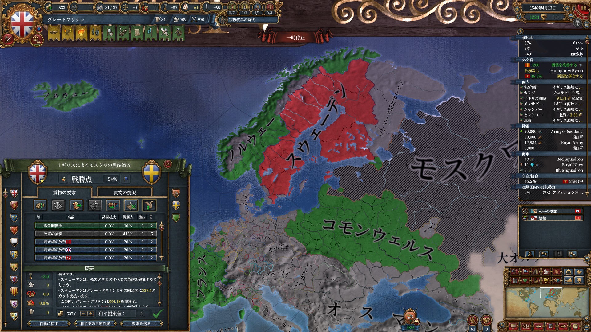 戦争自体はスムーズに進んではいたのですが、評価点の関係でオスマンから同盟が切られそうになったため慌てて講和→大きなマイナス点の源となっているライバル認定されたコモンウェルスの同盟破棄としています。