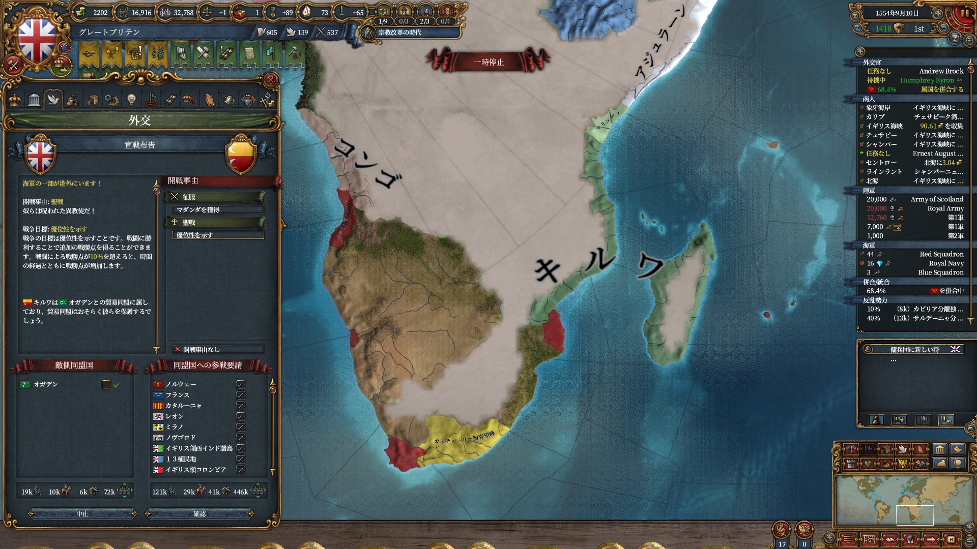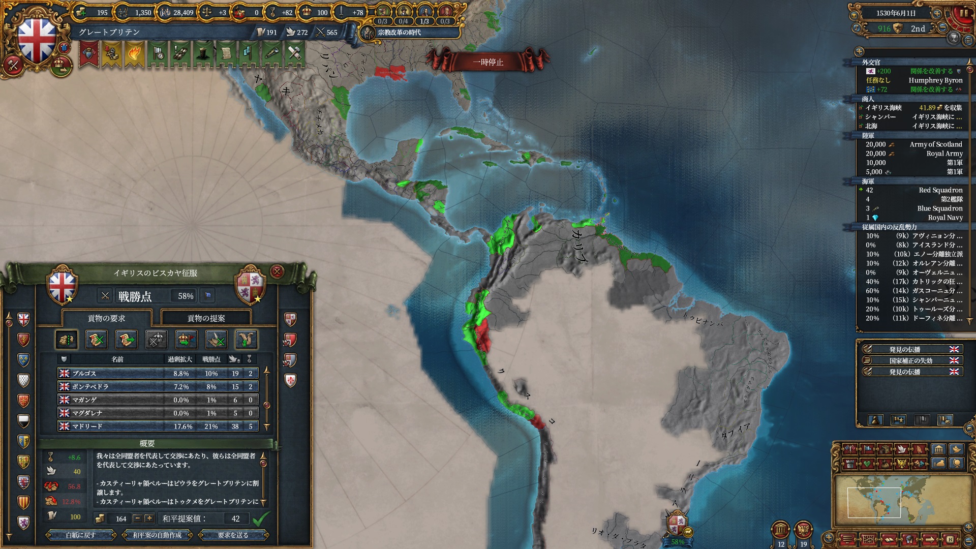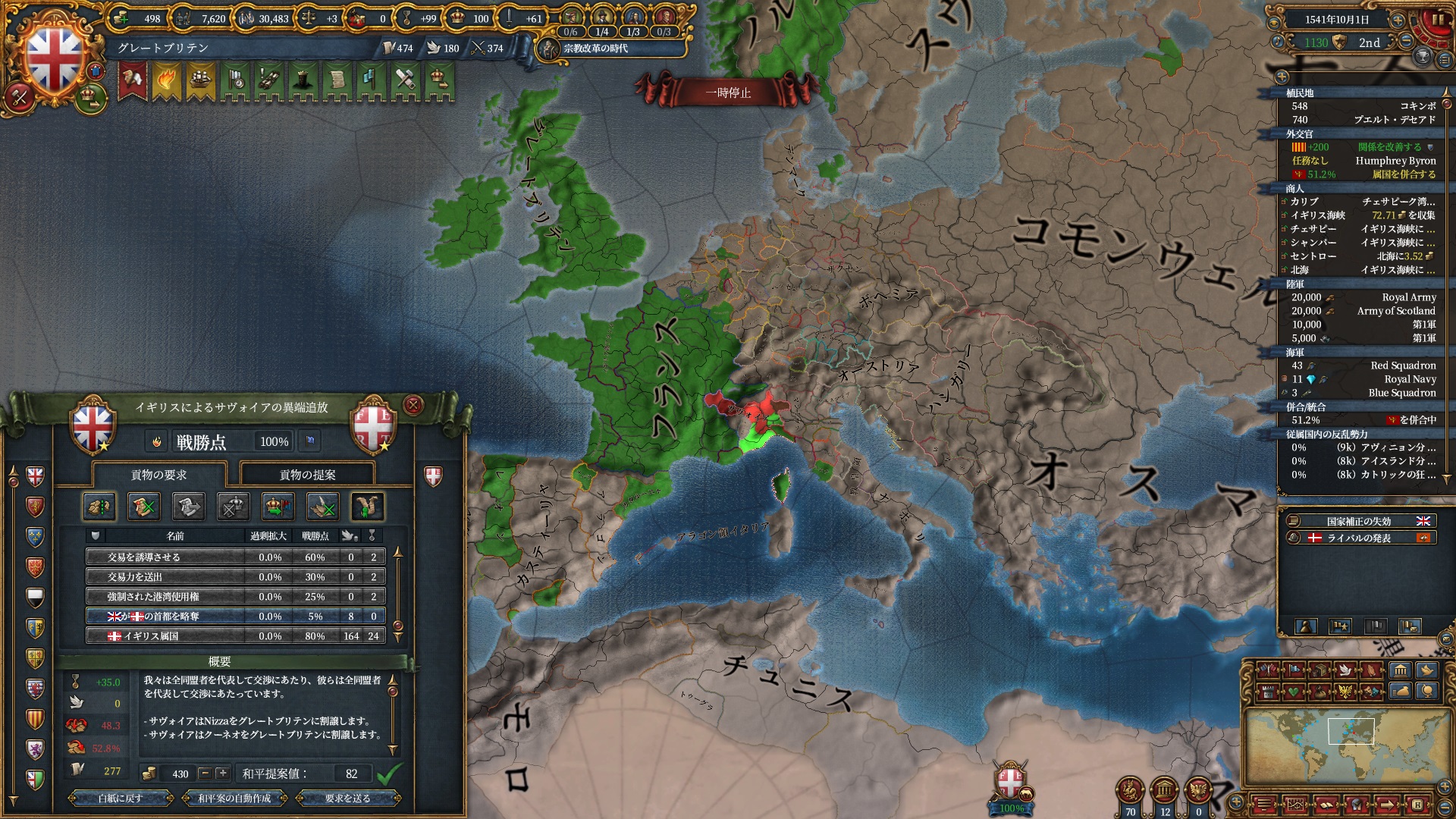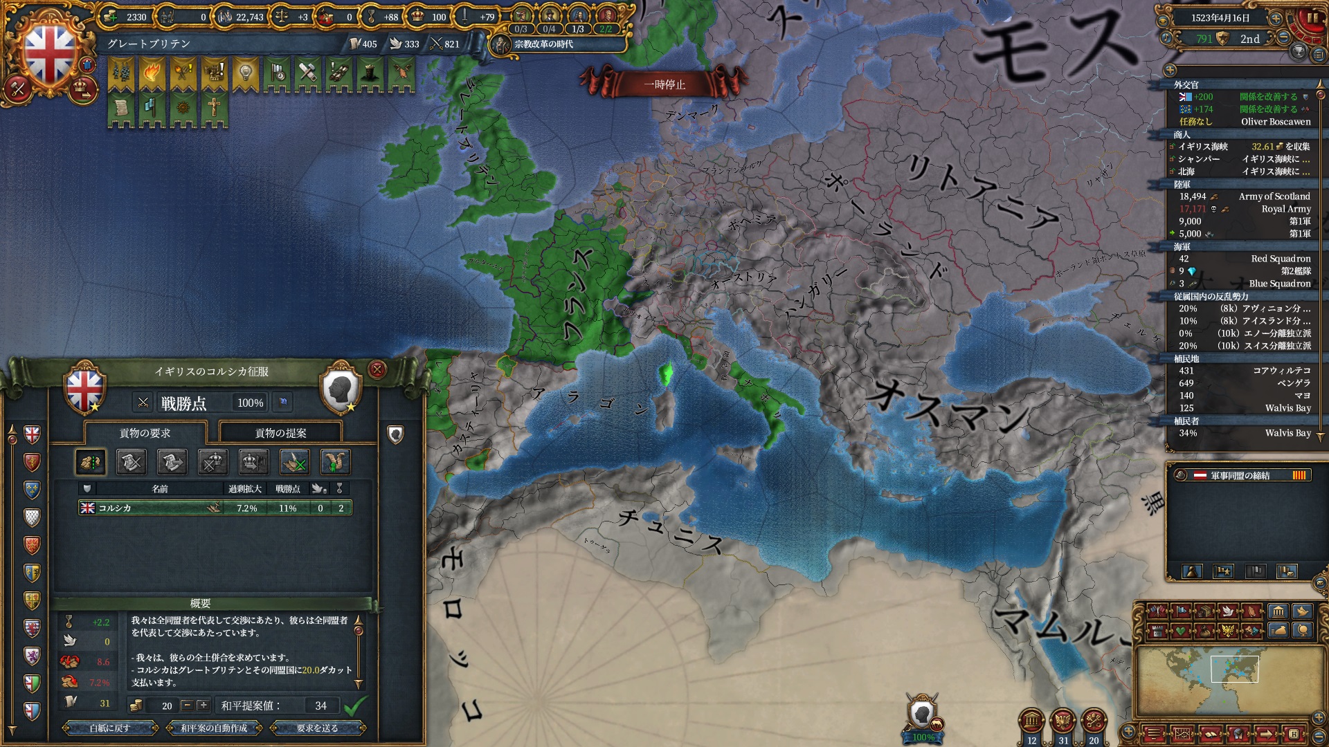 戦争自体はスムーズに進んではいたのですが、評価点の関係でオスマンから同盟が切られそうになったため慌てて講和→大きなマイナス点の源となっているライバル認定されたコモンウェルスの同盟破棄としています。