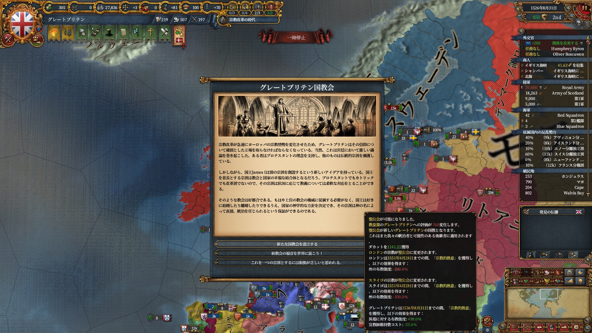 イングランド君主制を外しつつ、宣教師など改宗系の補正を手に入れに行きます。