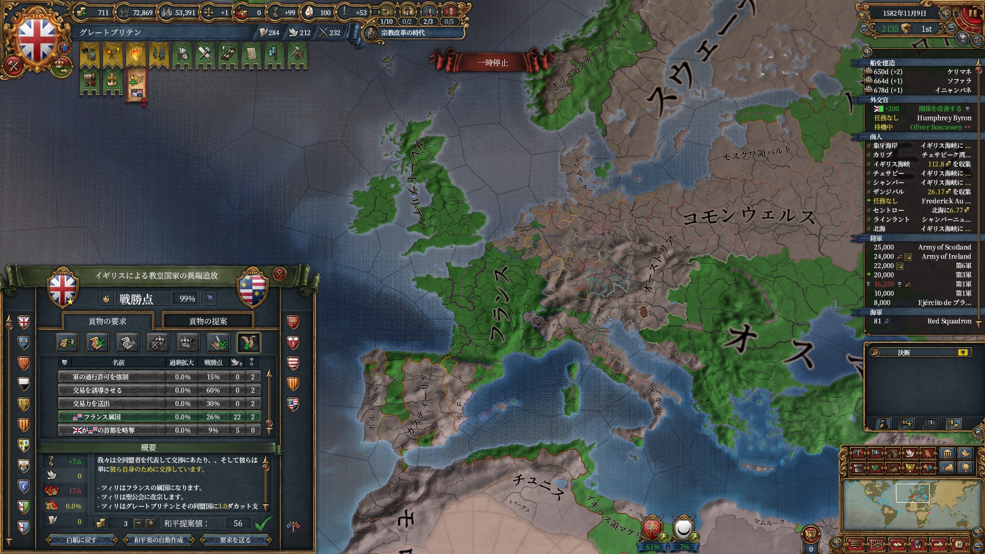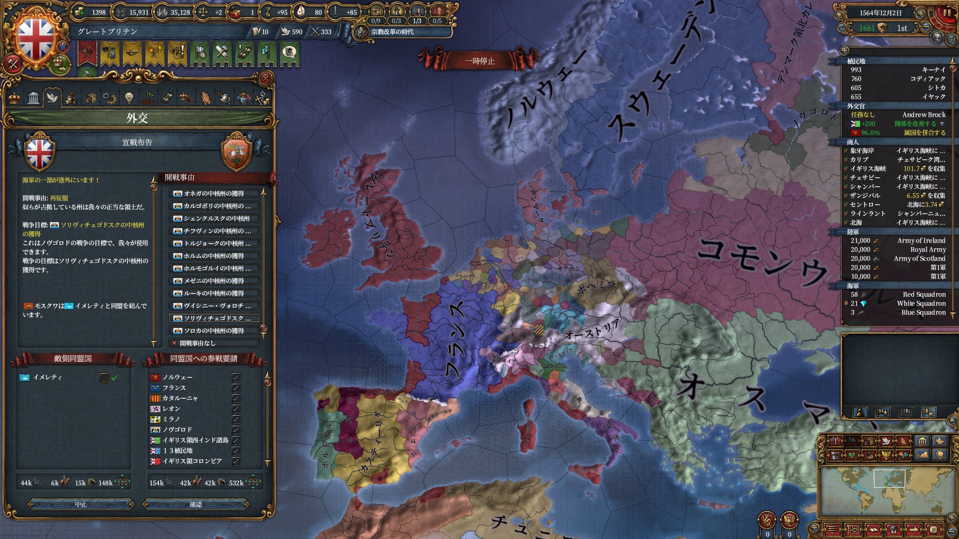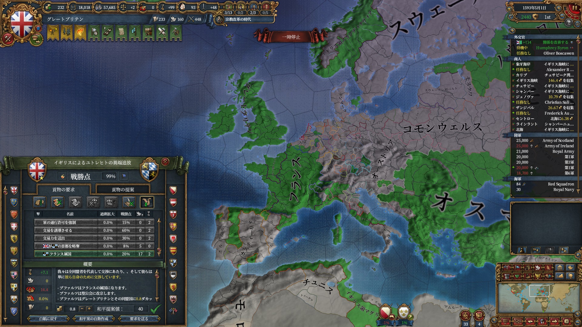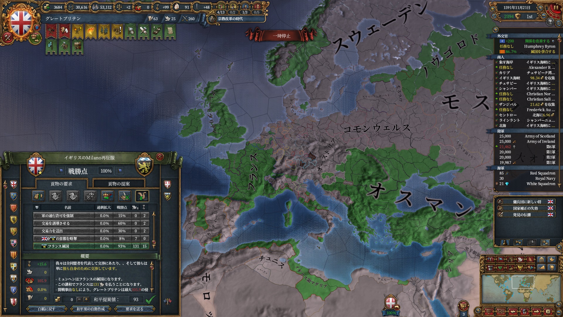 属国:フランス・カタルーニャ・レオン・ミラノ・ノヴゴロド・ノルウェー(併合中)