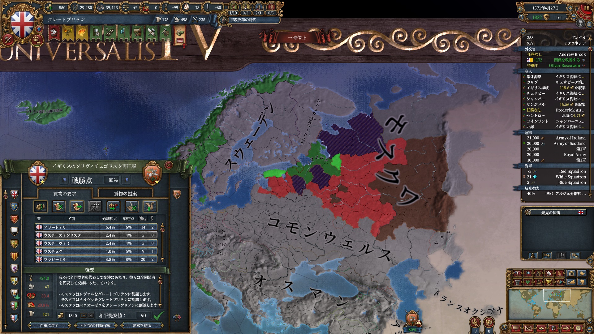 コモンウェルスは立地が悪すぎて既に怪しい事になっており放っておいても勝手に崩壊しそうな気配。モスクワを食って復活するかだけ注視すれば良いですね。