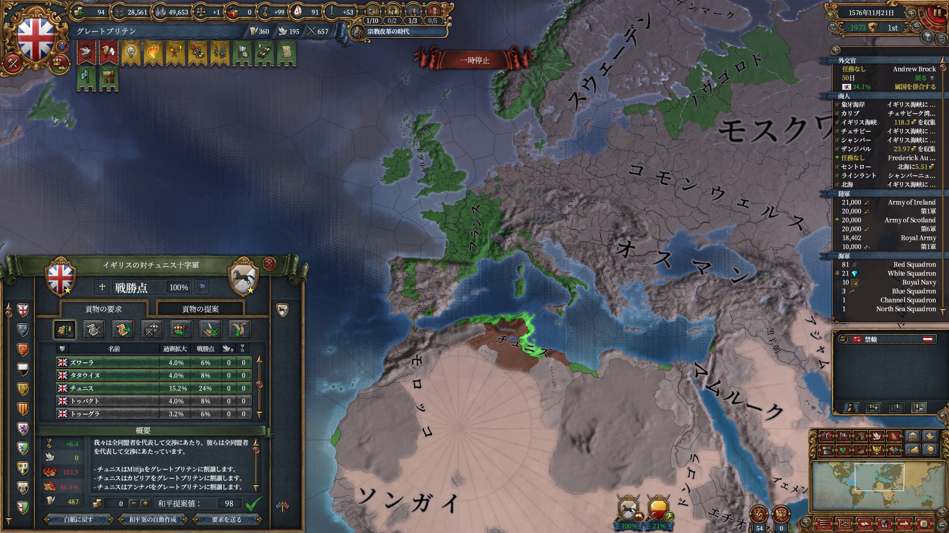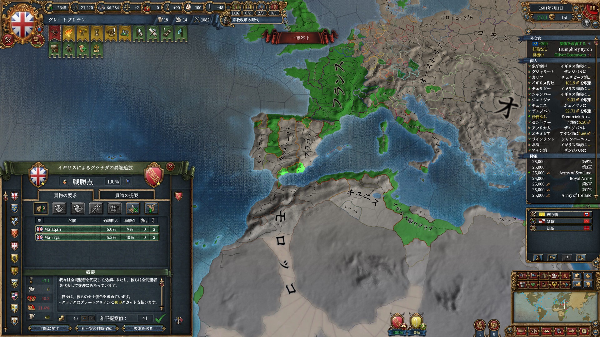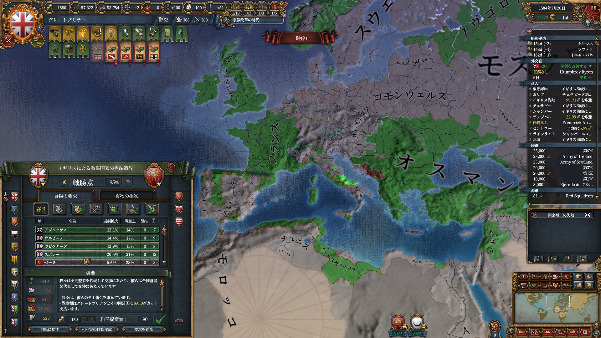 足掛かり自体が欧州中に点在している立地情勢になったので、絶対主義解禁までの間は列強の拡張妨害をしていく予定です。