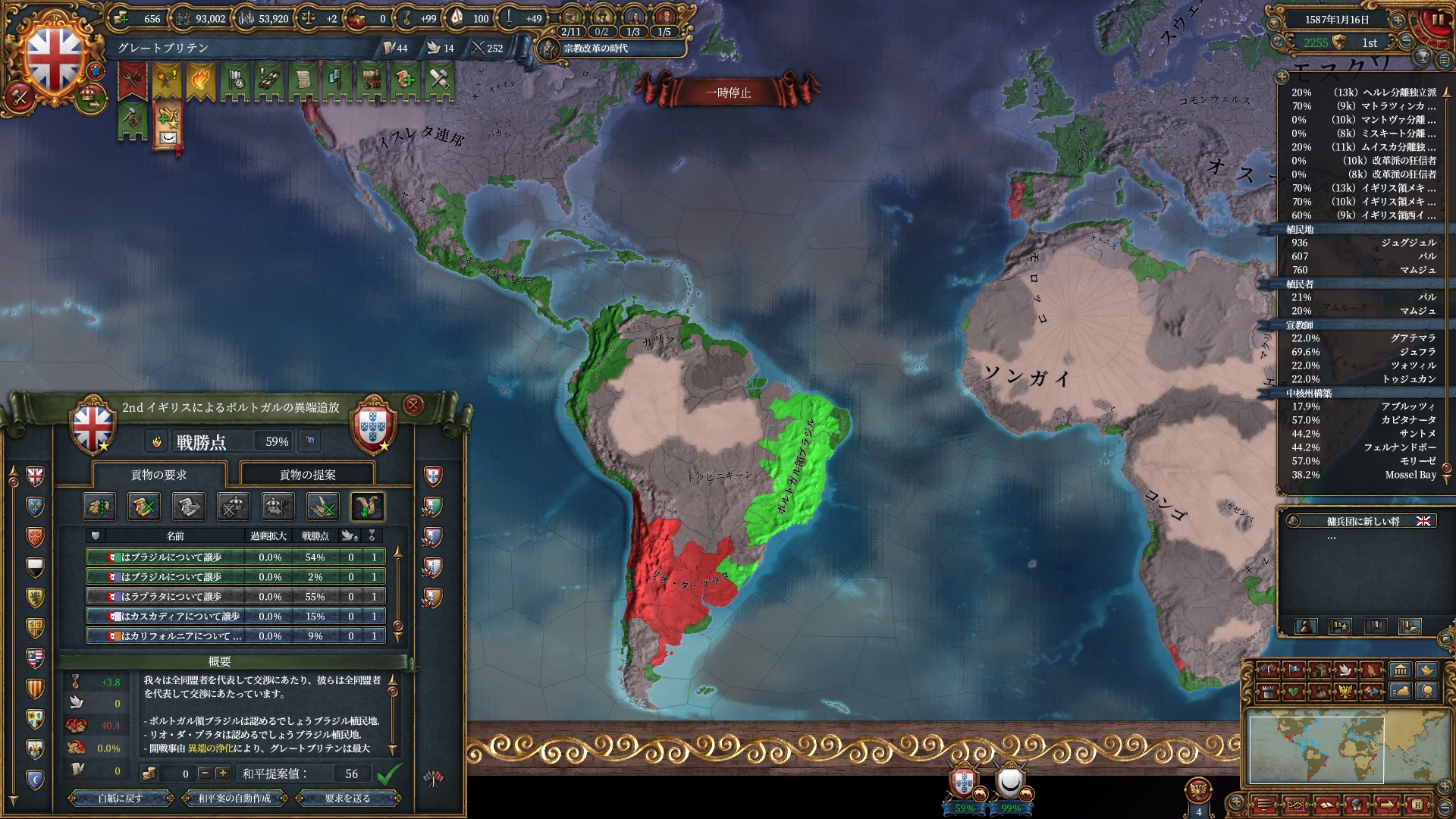 早期の新大陸統一を目指すと植民地国家のLDが割と無視できないレベルになるので、探検破棄→権勢へのアイデア切り替えは早めにやっておきたいところです。