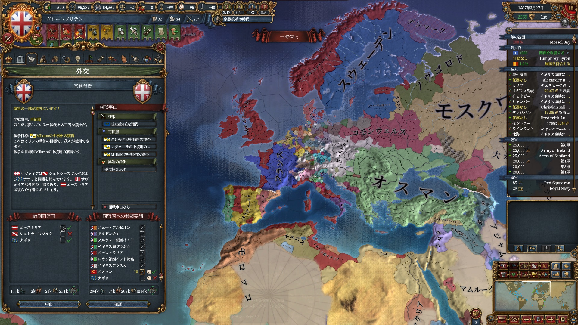 属国ミラノの再征服のためHREに侵攻、相手側も結構な規模になるのでオスマンを呼び出します。