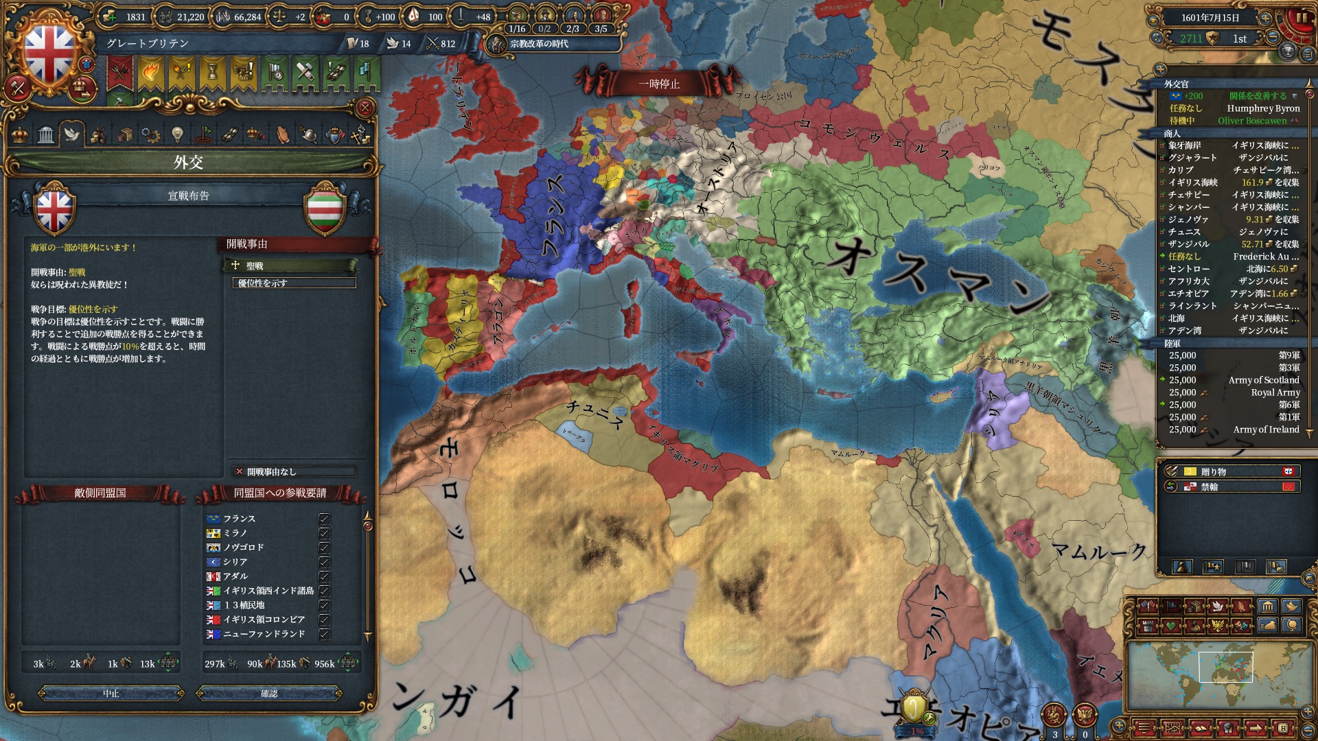 他、優先して叩いておきたい国としてはモスクワはタタール方面に広く伸びていく可能性があるのと、聖戦CBを使わない予定のマムルークは殴った時に文化グループ・宗教が一致しているオスマンにAEが飛びやすいので邪魔しておきたいぐらいです。