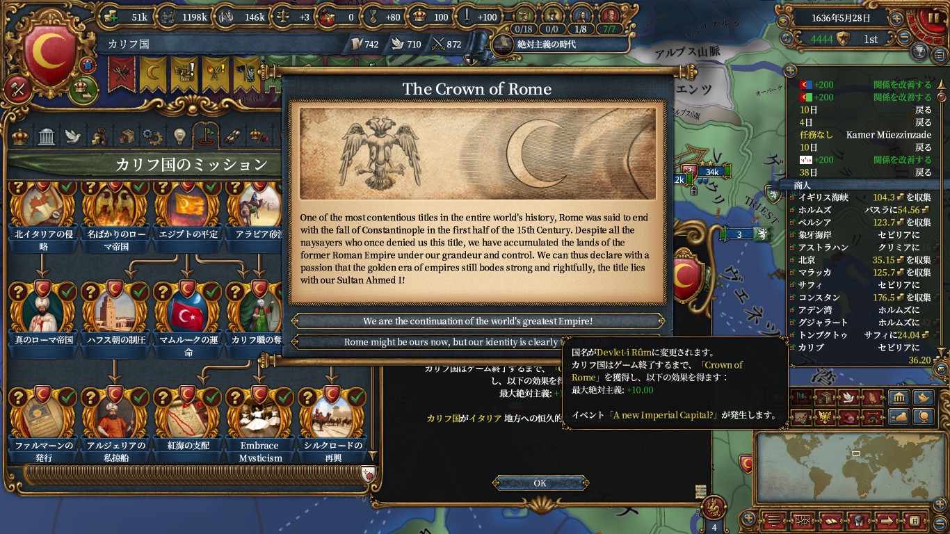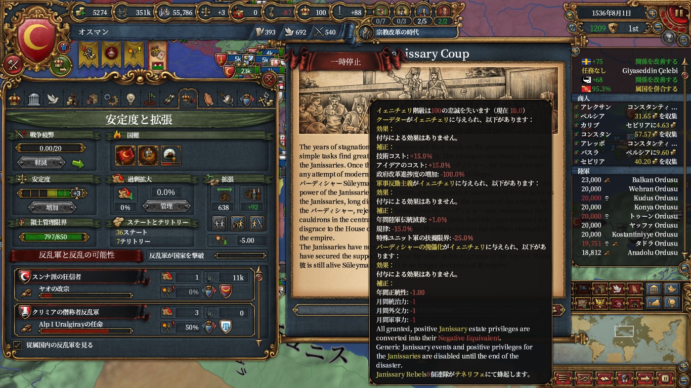 統治効率、安定度コスト減、外交併合コスト減、コアエヤレト化+20、イェニチェリ国難達成による全階級忠誠均衡+20%と影響+10%あるいは絶対主義+15も貰えます。