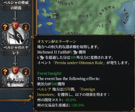 それに続くミッションではペルシア20州(直轄)保有でホラーサーン地方とコア化/併合コスト-5%が50年貰えます。永続ならなぁ。