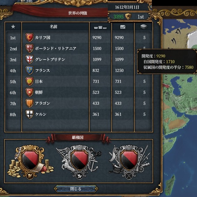 これらのミッション達成と、属国込みで開発4000以上、列強1位、覇権国などで統治効率+5%が貰えます。