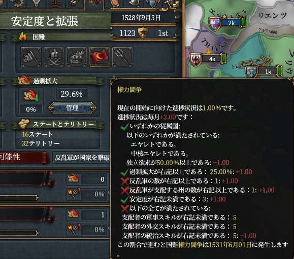 進捗が1%しかないと、発生に10年掛かるので属国から土地没収して過剰拡大を25%以上にしたり、宗教を強制((国難発生後はコアエヤレトからエヤレトにしてLDを帳消し)してLDを挙げたりして、進捗を3%にしました。