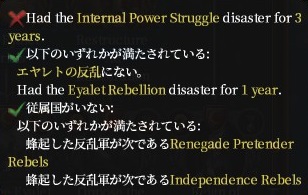 パシャ国難を締結させると不穏度-2と分離主義-5が永続で貰えますが、国難中不穏度+10と終結させるために5年耐える必要があるのがキツすぎます。