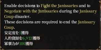 そして、イェニチェリ国難が発動したら、イェニチェリの対峙ディシジョンの3つすべてを実行して、反乱を起こさせます。