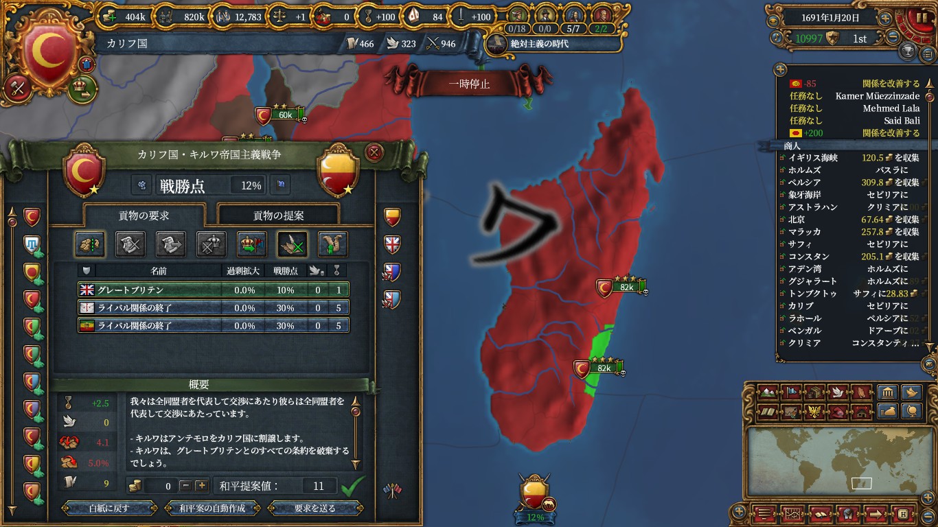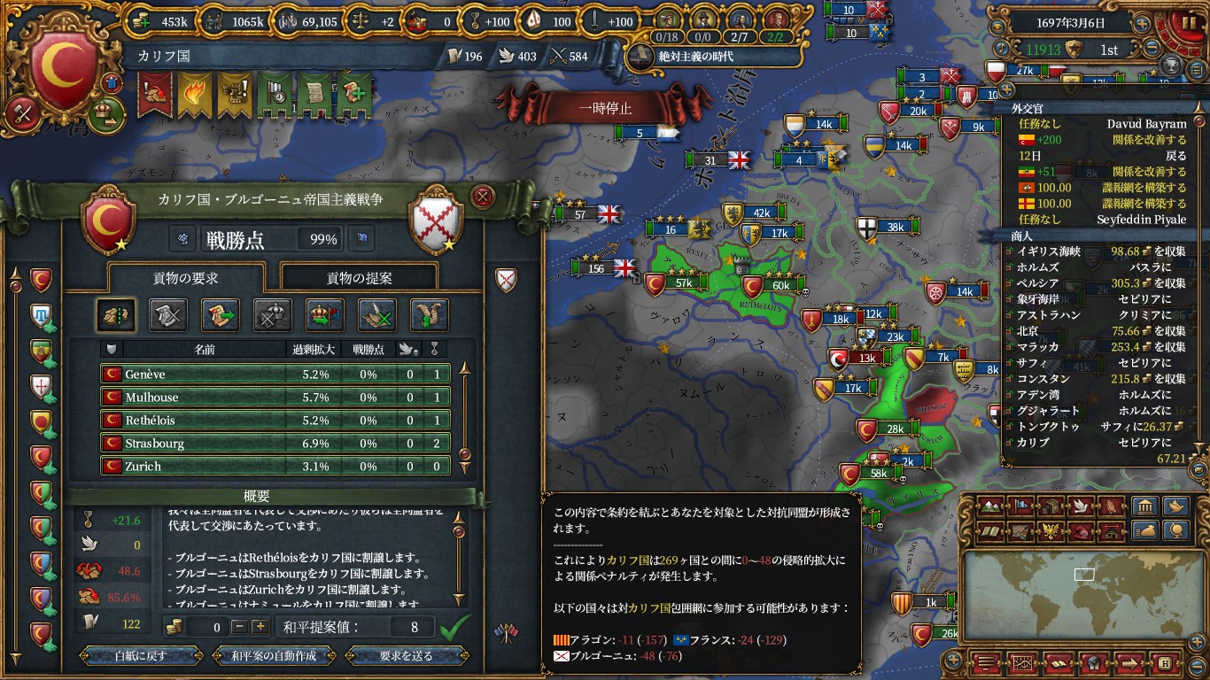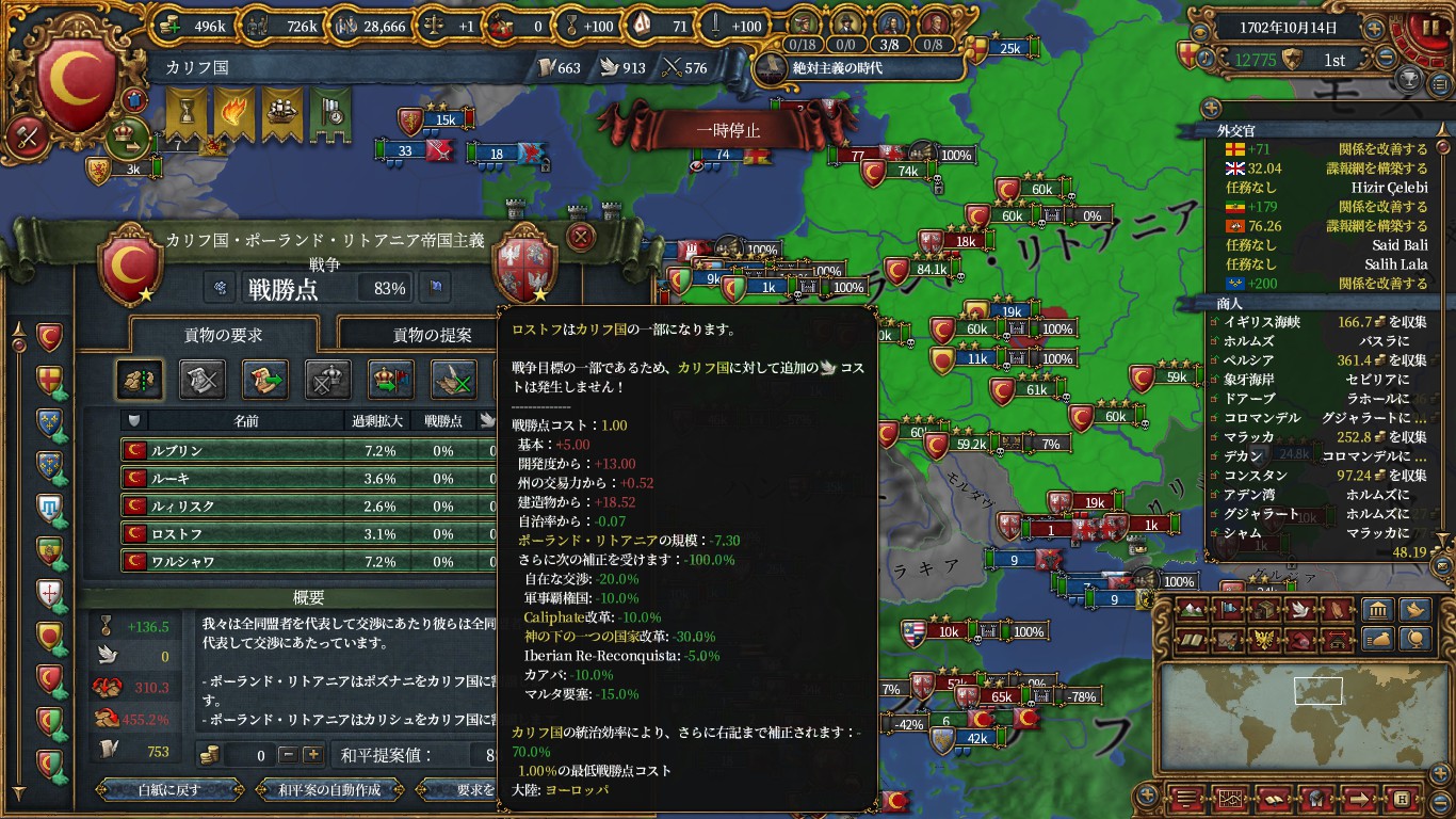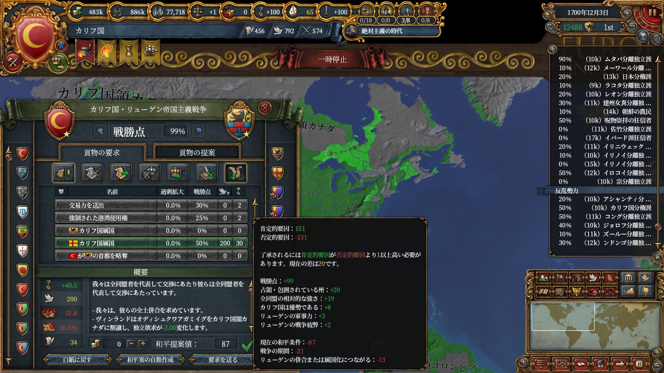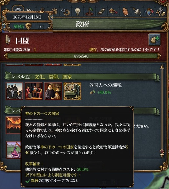 これぐらい戦勝点コストを盛れれば、統治効率による戦勝点コスト減に頼る必要がないため、革命による不穏度に対しても絶対主義を下げて対応できます。