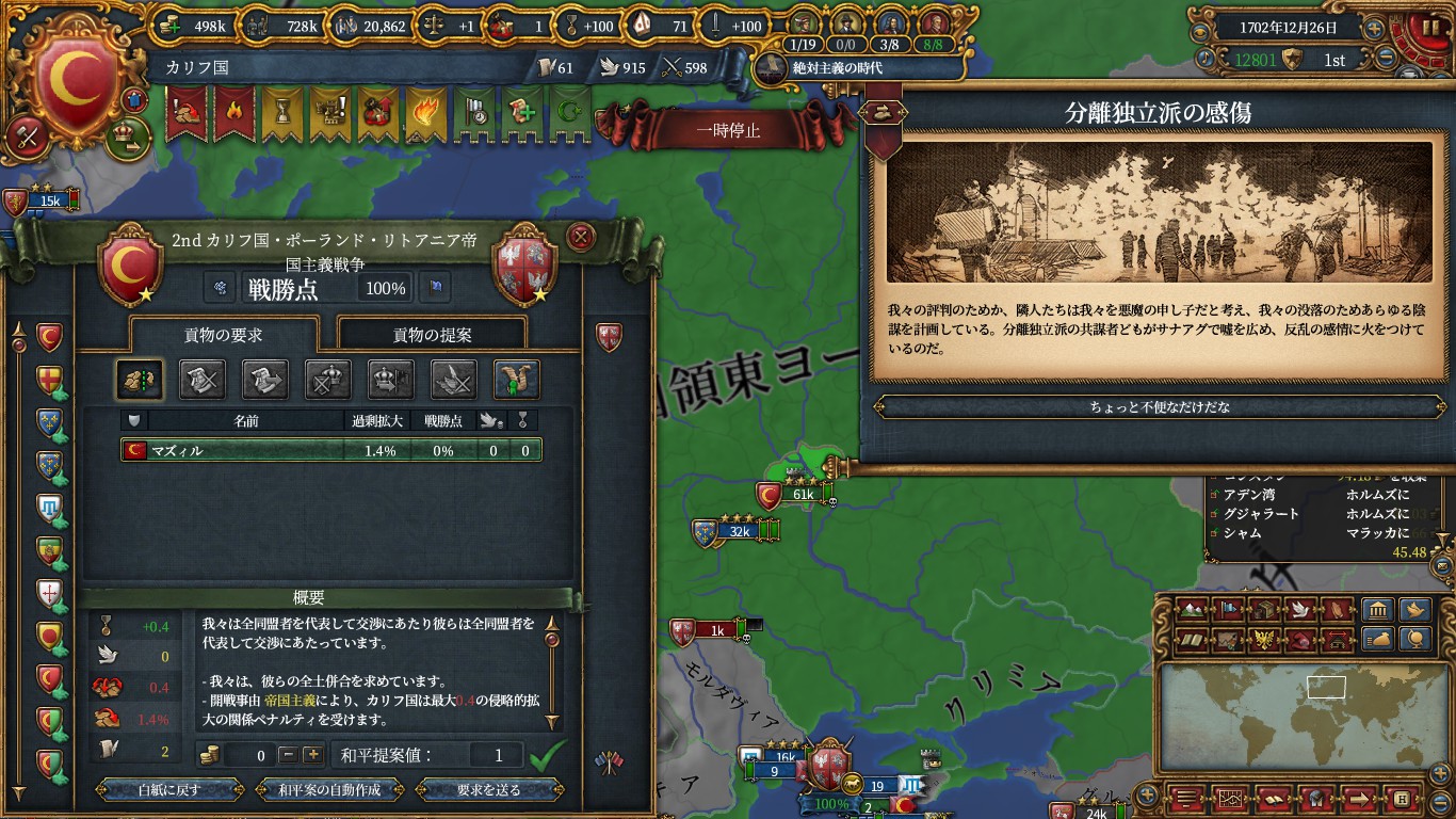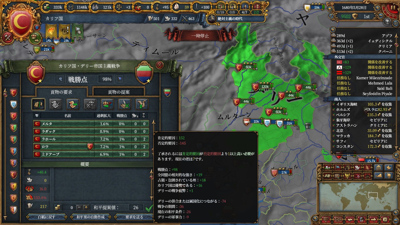 オスマンの場合、外交評判上昇による属国化のしやすさ上昇、州戦勝点コスト減-20%、コンプリートボーナスの外交行動による安定度低下の緩和で属国化のための婚姻を行いやすくなることが良いですね。