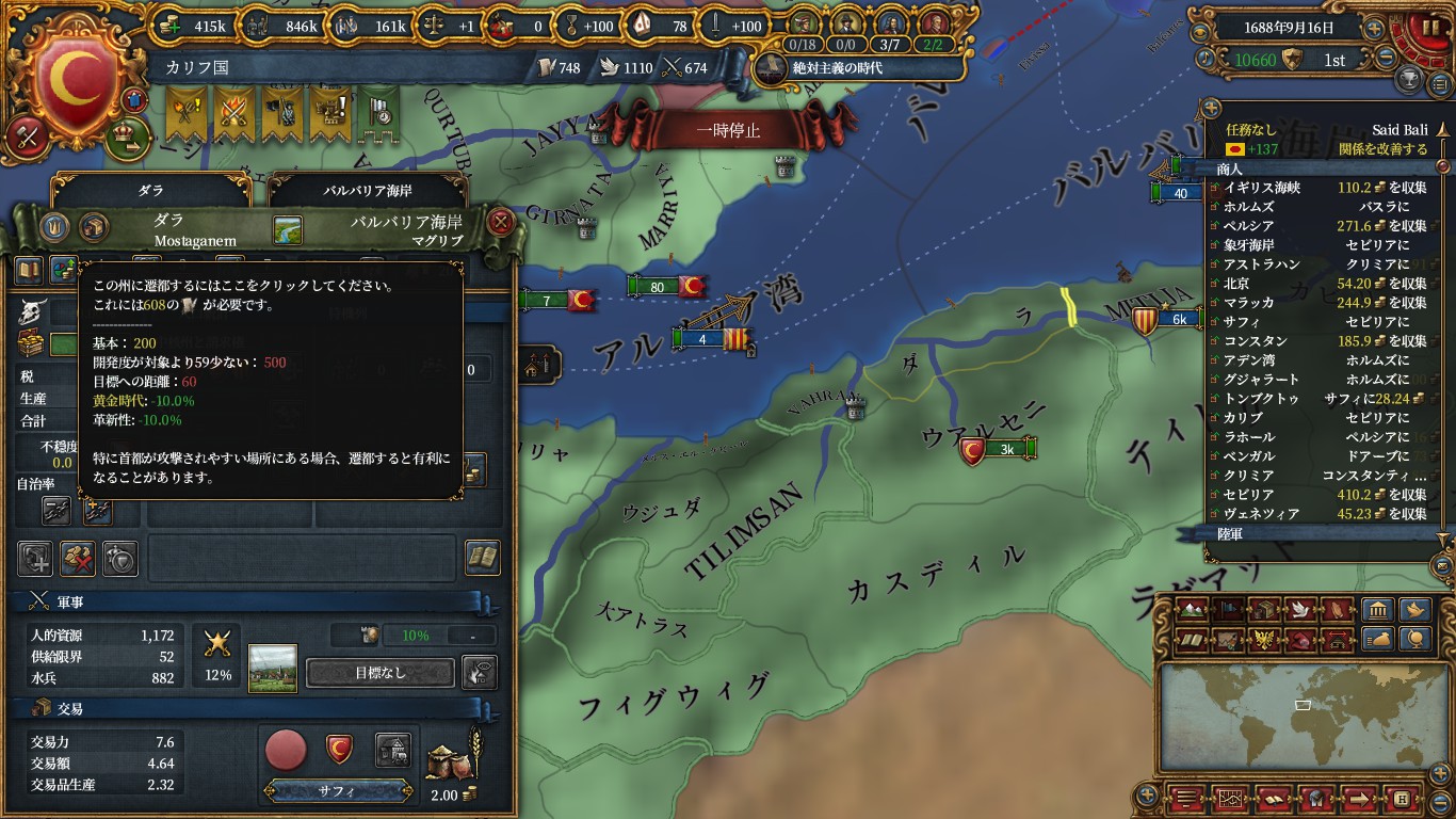 カスティーリャからテネリフェを奪うかテネリフェを取らない場合は、ミッションから貰えるモロッコエヤレトCBを用いて、エヤレト化しつつ西端の領土を取って植民地距離を伸ばすことになります。