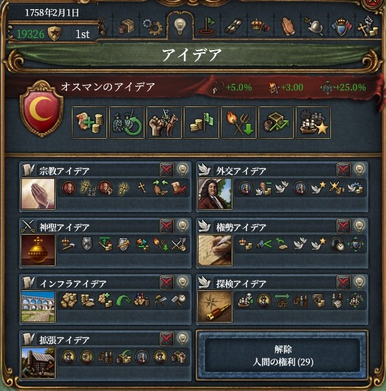 また、入植しない場合のオスマンは外交/権勢/諜報と序中盤から取りたい外交系のアイデアは多いですが、統治アイデアとなると序中盤で取りたいアイデアは聖戦CBで不当な要求を無視できる宗教が一番秀でています。ですので、アイデアグループの種類の分散をしたい、あるいはアイデアグループの制限を解除してない場合はぜひ取りたいですかね。