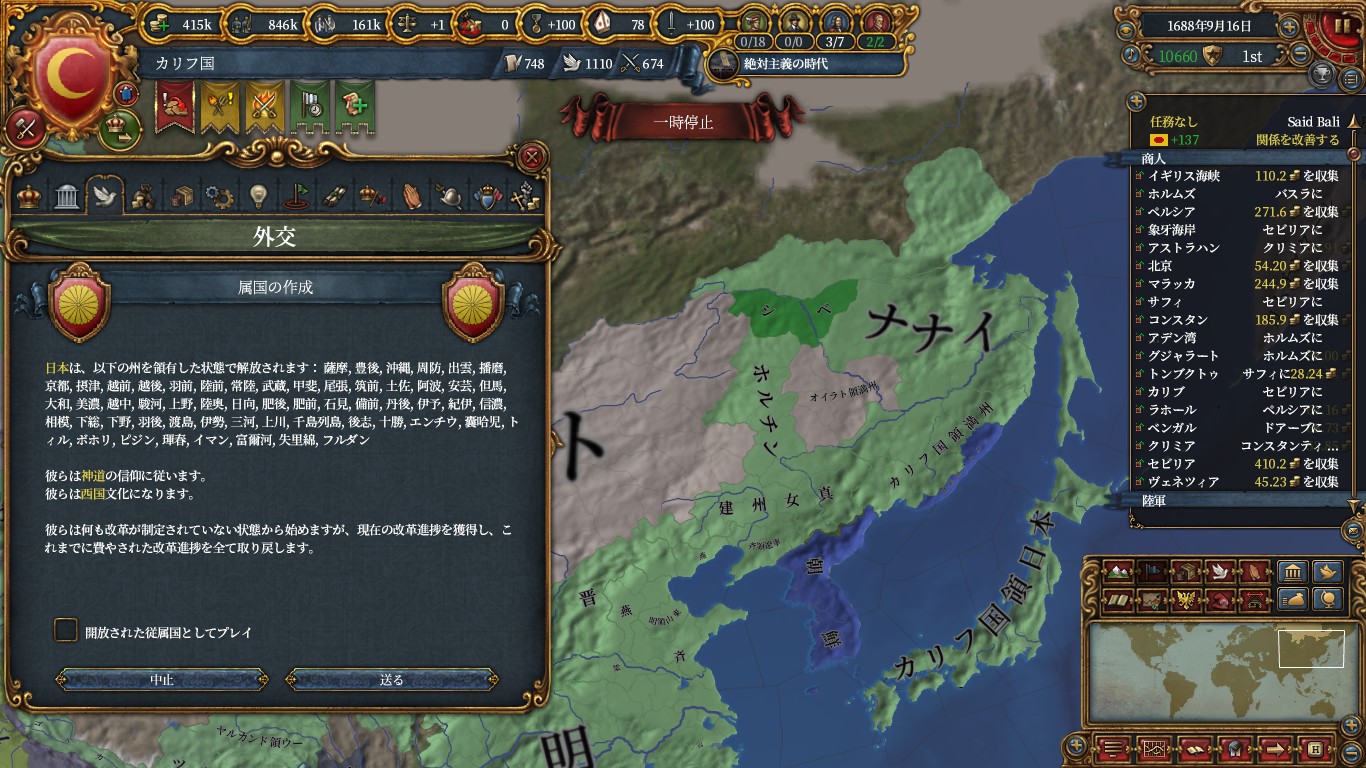 属国が無数にある状況にも関わらず、普通にプレイできる速度なのは幕府と違いありがたかったです。徴兵画面なんかは重かったですが。