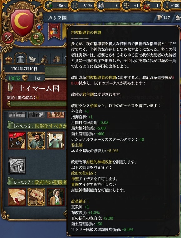神権改革の多さもオスマンミッションによる政府改革無償化やナポリ/ヴェネチアのモニュメントの政府改革増で改革点が余りやすく、エヤレトのおかげでステート以外の土地をあまり抱える必要がないため、平均自治率も低くしやすいです。